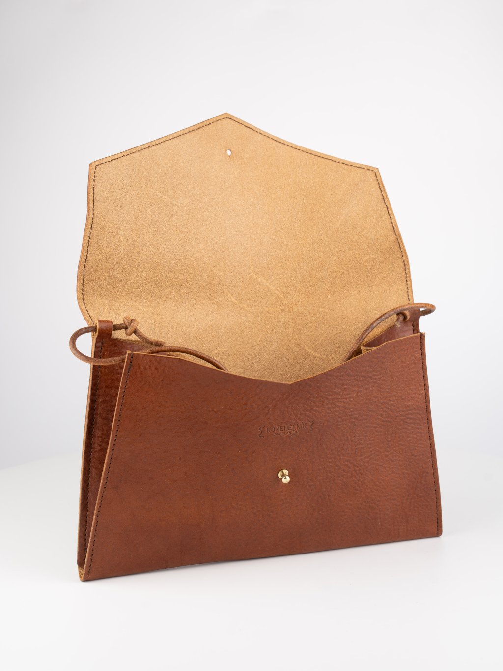 Tahle elegantní kabelka vychází z oblíbeného psaníčka, ale nabízí více prostoru díky chytrému rozevíracímu střihu. Pohodlně do ní uložíte telefon, klíče, peněženku i další nezbytnosti a oceníte i praktickou vnitřní kapsičku. Sedlářský knoflík zajišťuje jednoduché, ale spolehlivé zapínání. Nastavitelný kožený popruh s rozšířením si přizpůsobíte přesně podle sebe, případně ho můžete zkrátit nebo úplně schovat. Kabelku tak snadno proměníte v elegantní psaníčko do ruky i stylový doplněk na předloktí.