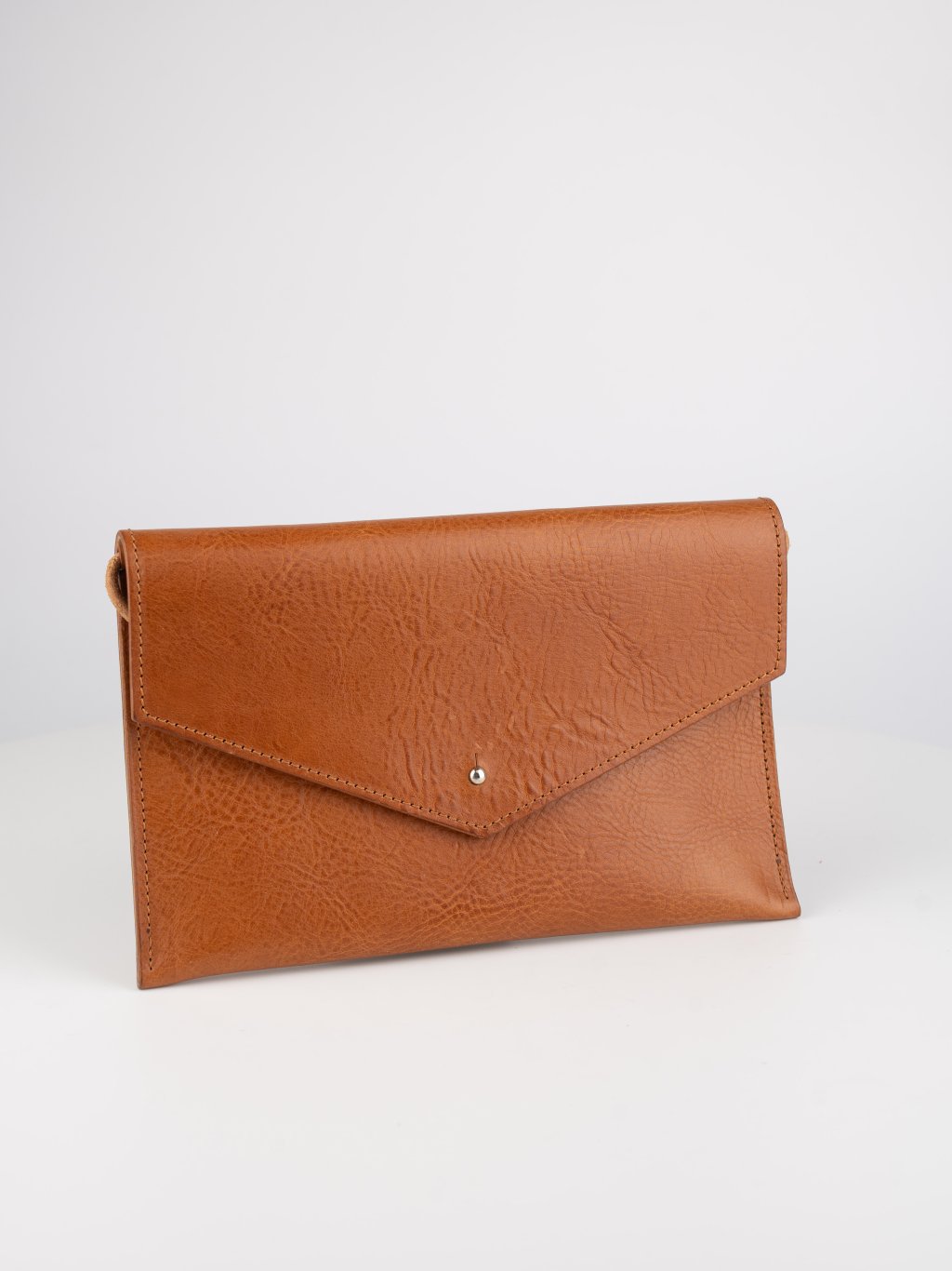 Minimalistické dámské psaníčko ze dvou vrstev usně - hlavní konstrukce z měkčí na omak velmi příjemné hovězí usně s decentní strukturou, podšívaná tenkou světlou vepřovicí s žehleným povrchem. Luxusní doplněk na mobilní telefon, klíče a další nezbytnosti, vhodný do města, na párty i pro speciální příležitosti. Jednoduché zapínání řeší sedlářský knoflík. Tenký popruh z kulatého koženého řemínku můžete odepnout nebo schovat dovnitř pro snadné nošení v ruce.