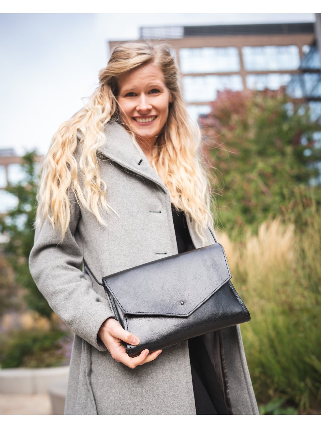 Tahle elegantní kabelka vychází z oblíbeného psaníčka, ale nabízí více prostoru díky chytrému rozevíracímu střihu. Pohodlně do ní uložíte telefon, klíče, peněženku i další nezbytnosti a oceníte i praktickou vnitřní kapsičku. Sedlářský knoflík zajišťuje jednoduché, ale spolehlivé zapínání. Nastavitelný kožený popruh s rozšířením si přizpůsobíte přesně podle sebe, případně ho můžete zkrátit nebo úplně schovat. Kabelku tak snadno proměníte v elegantní psaníčko do ruky i stylový doplněk na předloktí.