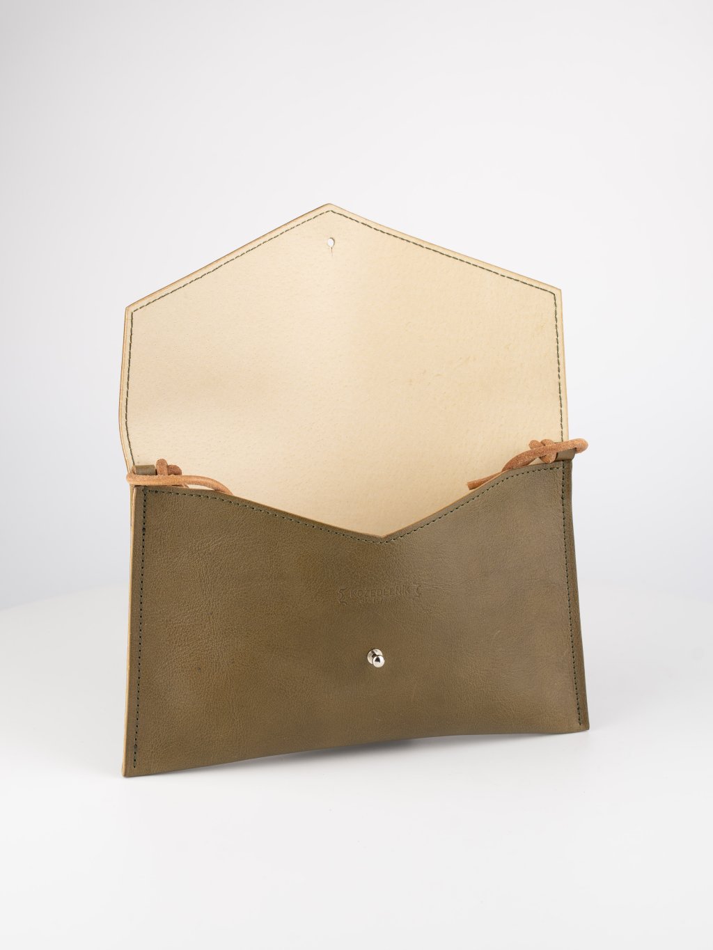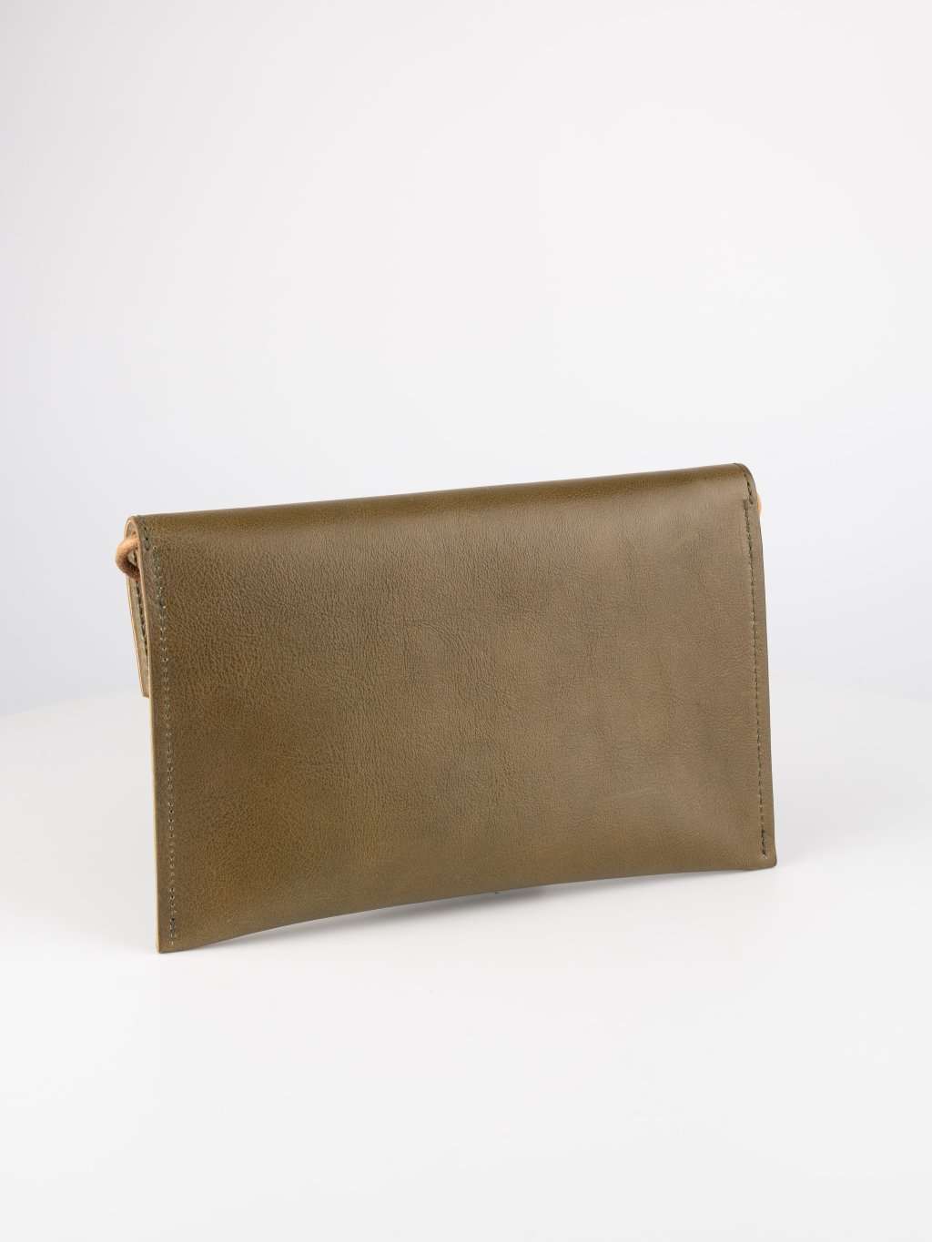 Minimalistické dámské psaníčko ze dvou vrstev usně - hlavní konstrukce z měkčí na omak velmi příjemné hovězí usně s decentní strukturou, podšívaná tenkou světlou vepřovicí s žehleným povrchem. Luxusní doplněk na mobilní telefon, klíče a další nezbytnosti, vhodný do města, na párty i pro speciální příležitosti. Jednoduché zapínání řeší sedlářský knoflík. Tenký popruh z kulatého koženého řemínku můžete odepnout nebo schovat dovnitř pro snadné nošení v ruce.