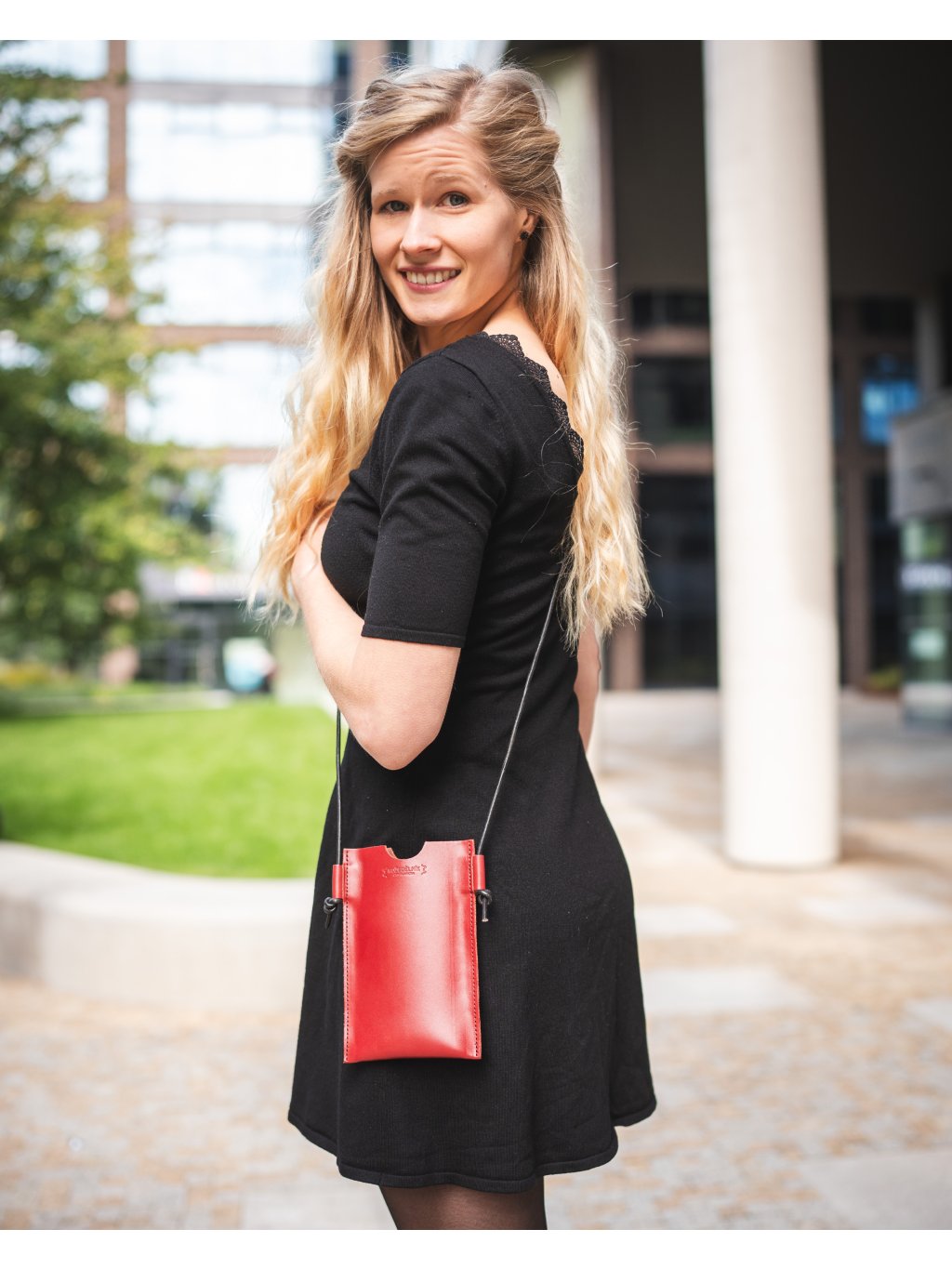 Elegantní a praktické pouzdro na telefon vyrobené z 2 mm silné hladké hovězí třísločiněné usně z Itálie. Useň má zabarvený a hladký rub, takže nepotřebuje podšívku, je odolná a nehrozí, že by poškrábala displej vašeho telefonu. Když ho potřebujete vytáhnout, jde to snadno a rychle. Popruh je dostatečně dlouhý, ale pokud chcete, můžete si ho jednoduše zkrátit pomocí uzlíků.