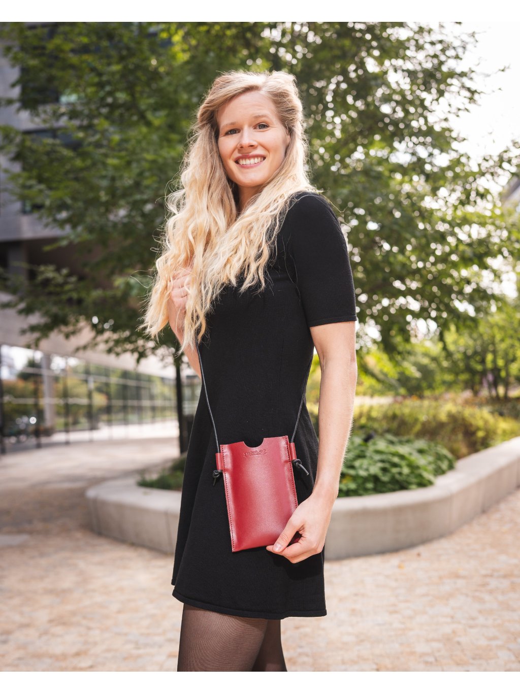 Elegantní a praktické pouzdro na telefon vyrobené z 2 mm silné hladké hovězí třísločiněné usně z Itálie. Useň má zabarvený a hladký rub, takže nepotřebuje podšívku, je odolná a nehrozí, že by poškrábala displej vašeho telefonu. Když ho potřebujete vytáhnout, jde to snadno a rychle. Popruh je dostatečně dlouhý, ale pokud chcete, můžete si ho jednoduše zkrátit pomocí uzlíků.