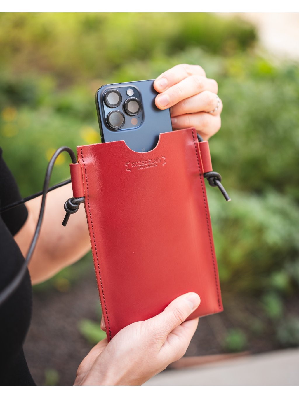 Elegantní a praktické pouzdro na telefon vyrobené z 2 mm silné hladké hovězí třísločiněné usně z Itálie. Useň má zabarvený a hladký rub, takže nepotřebuje podšívku, je odolná a nehrozí, že by poškrábala displej vašeho telefonu. Když ho potřebujete vytáhnout, jde to snadno a rychle. Popruh je dostatečně dlouhý, ale pokud chcete, můžete si ho jednoduše zkrátit pomocí uzlíků.