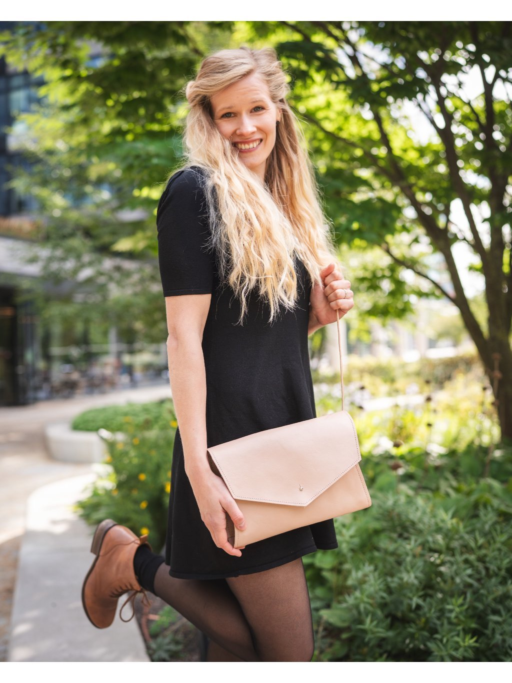Tahle elegantní kabelka vychází z oblíbeného psaníčka, ale nabízí více prostoru díky chytrému rozevíracímu střihu. Pohodlně do ní uložíte telefon, klíče, peněženku i další nezbytnosti a oceníte i praktickou vnitřní kapsičku. Sedlářský knoflík zajišťuje jednoduché, ale spolehlivé zapínání. Nastavitelný kožený popruh s rozšířením si přizpůsobíte přesně podle sebe, případně ho můžete zkrátit nebo úplně schovat. Kabelku tak snadno proměníte v elegantní psaníčko do ruky i stylový doplněk na předloktí.