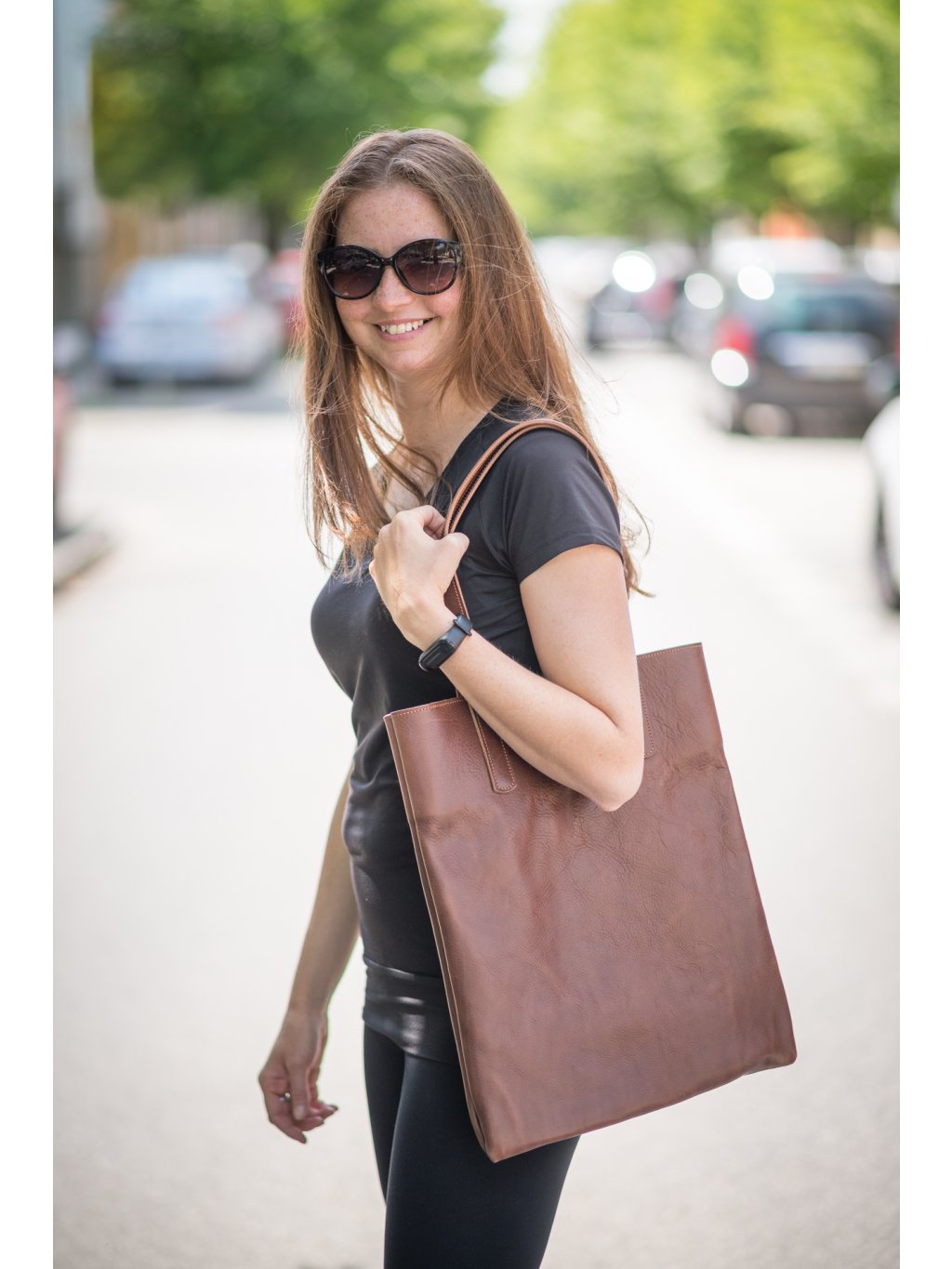 Díky jejich měkosti a dostatečné šířce se taška příjemně nosí přes rameno i na předloktí, a podle výšky (modelka má cca 1,7m) ji můžete nosit i jen tak v ruce.
