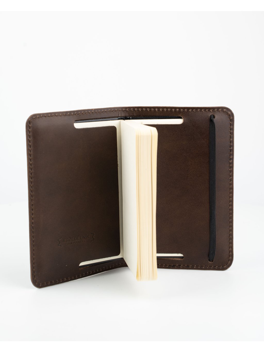 Decentní obal z tenké hlazené hovězí usně včetně linkovaného zápisníku v kapesní velikosti A6 = ideální velikost tak akorát do kapsy i do nejmenší kabelky. Díky protažené konstrukci vnitřních "uší" obalu zůstávají stránky zápisníku při psaní krásně rovné - doslova nemáte urostřed stránky hrbol. Nechtěnému otevírání zabrání pruženka na zápisníku, přetažená přes obal.