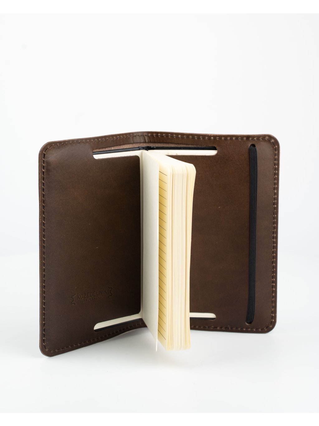 Decentní obal z tenké hlazené hovězí usně včetně linkovaného zápisníku v kapesní velikosti A6 = ideální velikost tak akorát do kapsy i do nejmenší kabelky. Díky protažené konstrukci vnitřních "uší" obalu zůstávají stránky zápisníku při psaní krásně rovné - doslova nemáte urostřed stránky hrbol. Nechtěnému otevírání zabrání pruženka na zápisníku, přetažená přes obal.