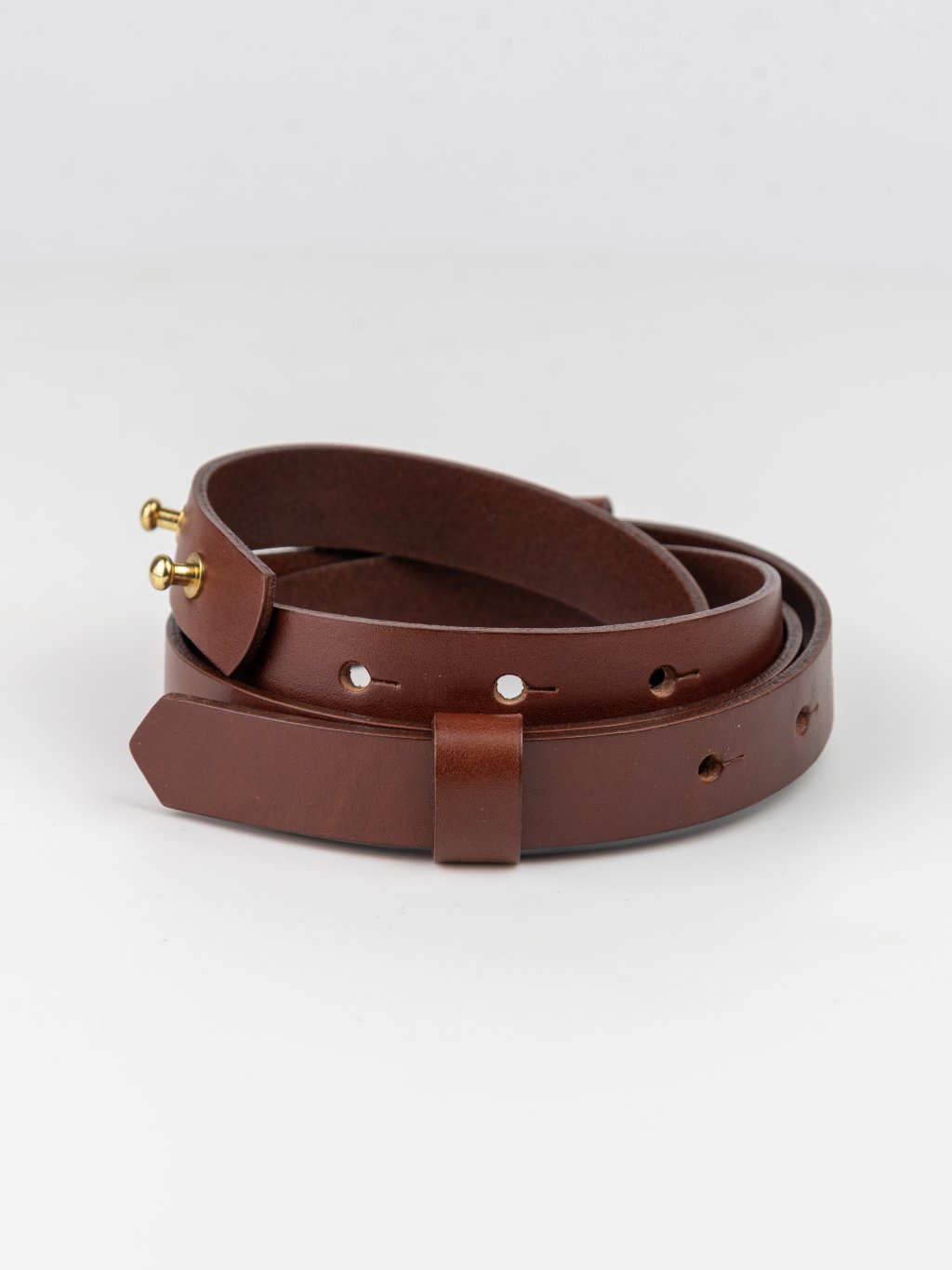 Kvalitní dámský opasek ze dvou pečlivě slepených vrstev barevné hovězí kůže a s decentním zapínáním na sedlářské knoflíky ve zlaté povrchové úpravě.