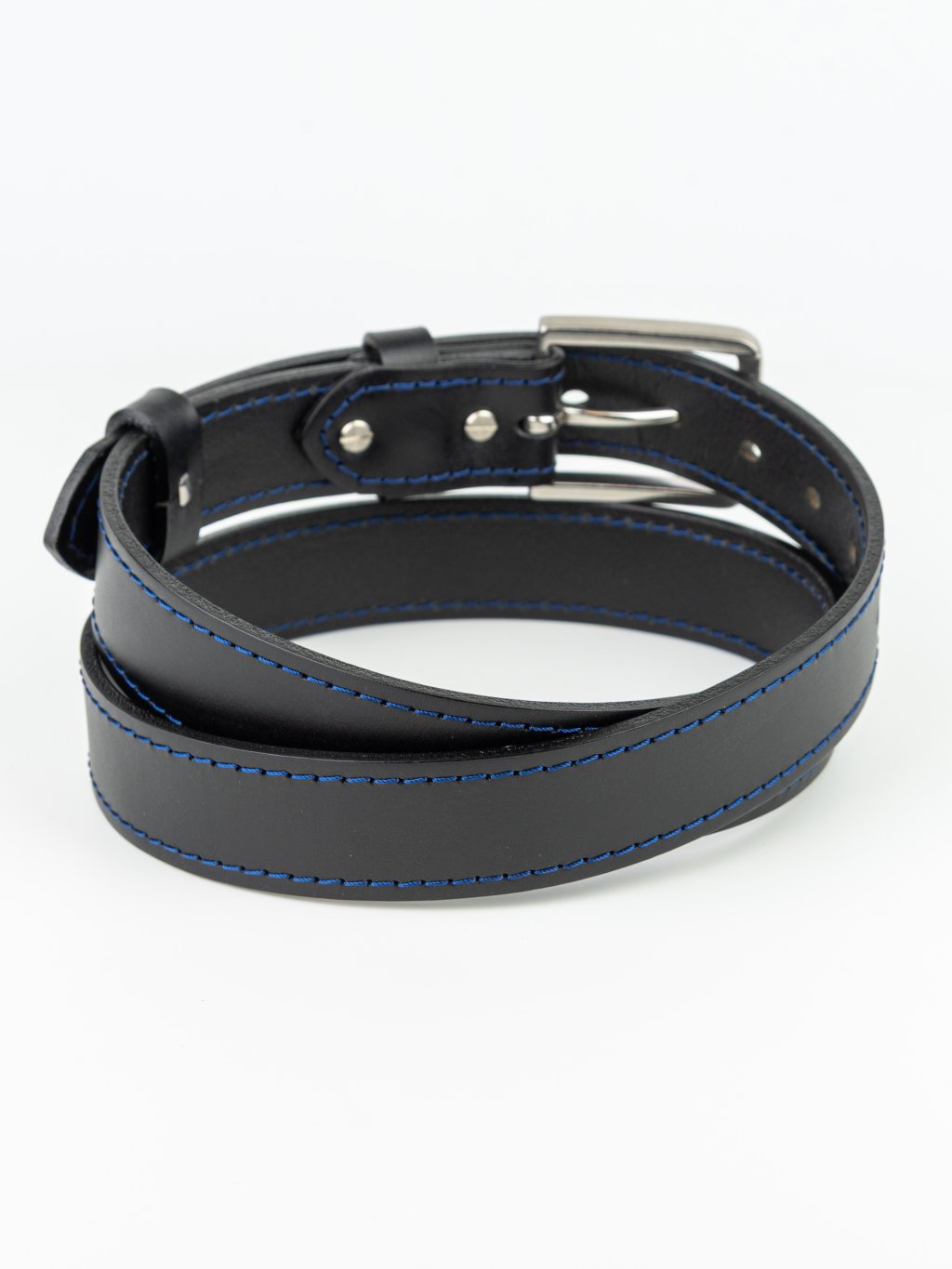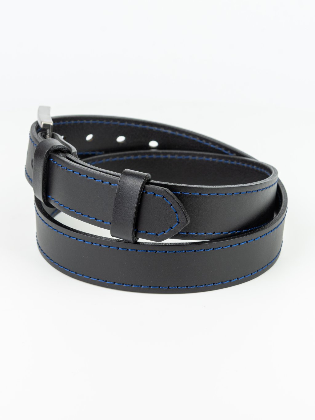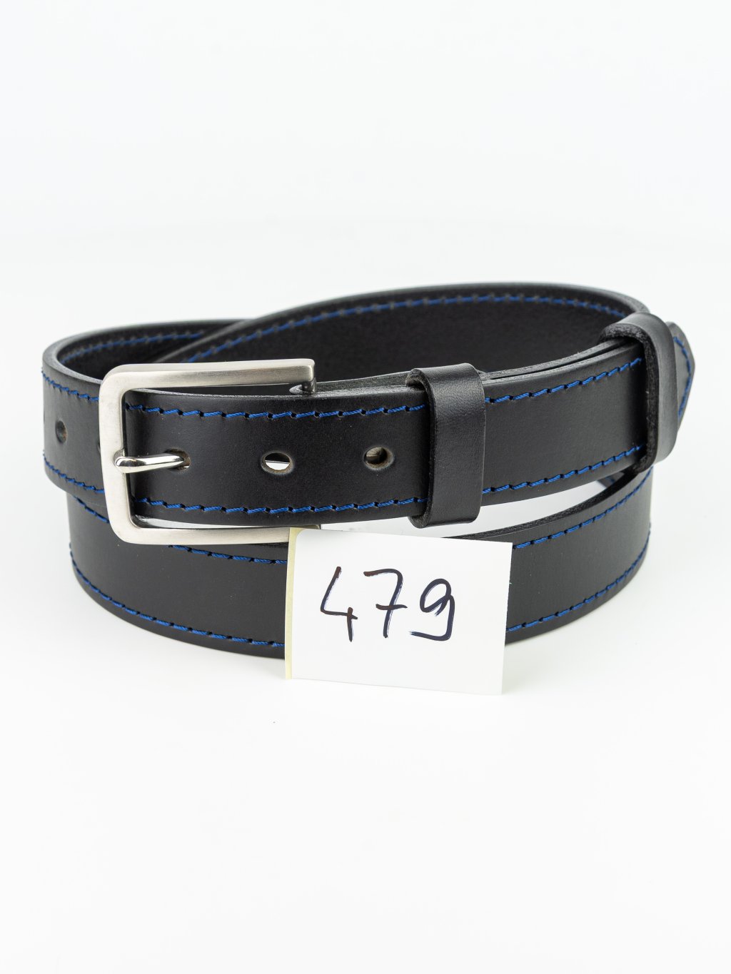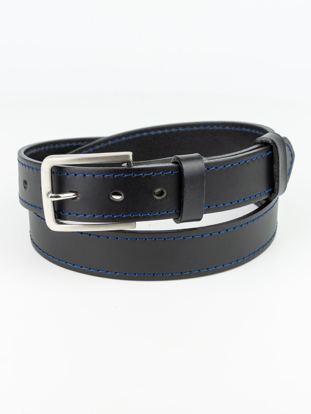 479 Henry opasek - černý prošívaný modrou, ocelová spona, velikost M (Zachraň kůži = více ks) Univerzální pánský opasek. 1. jakost. Velikost M (na obvod pasu 92 – 107 cm). Délka opasku vč. spony cca 119 cm.