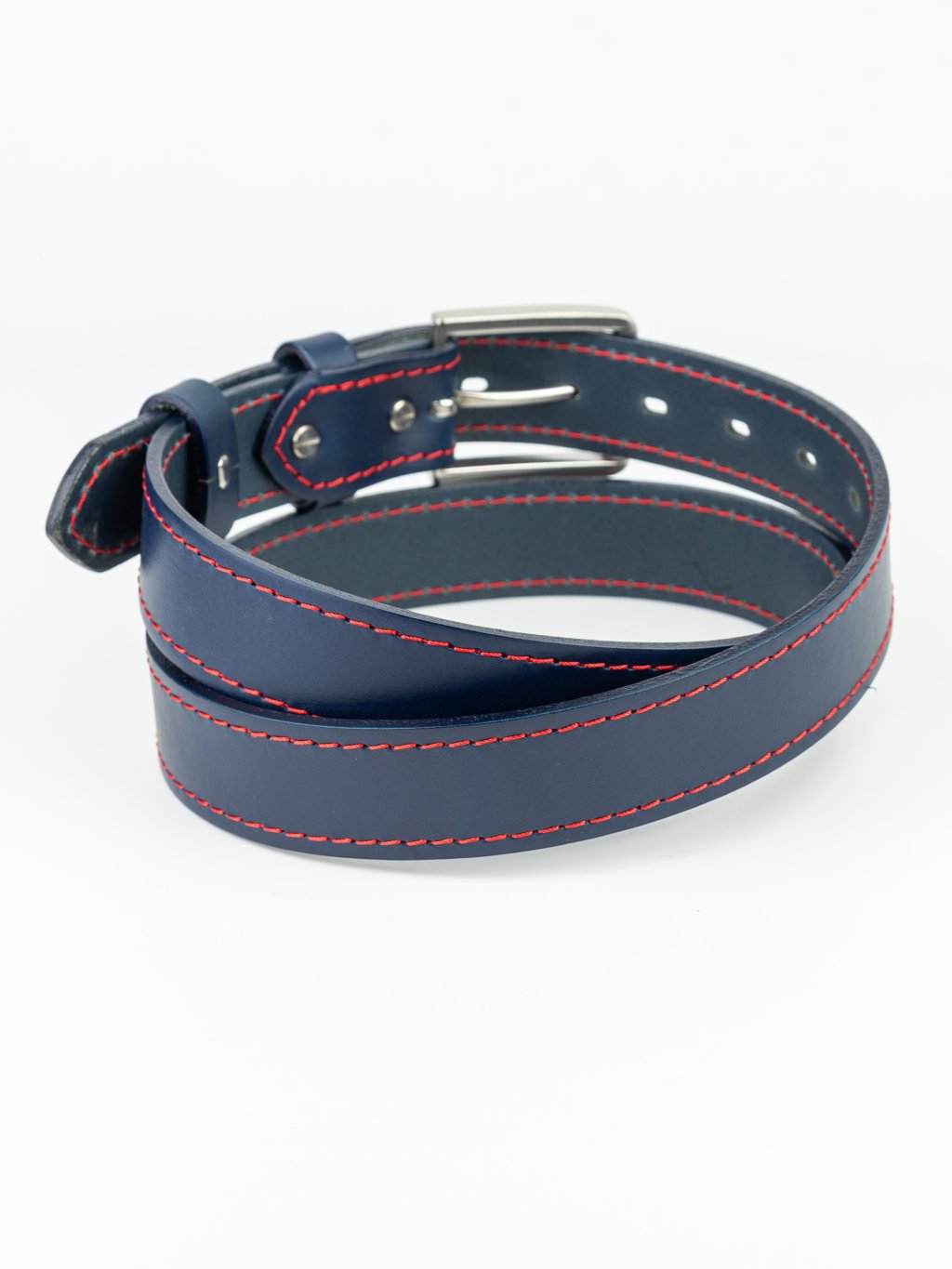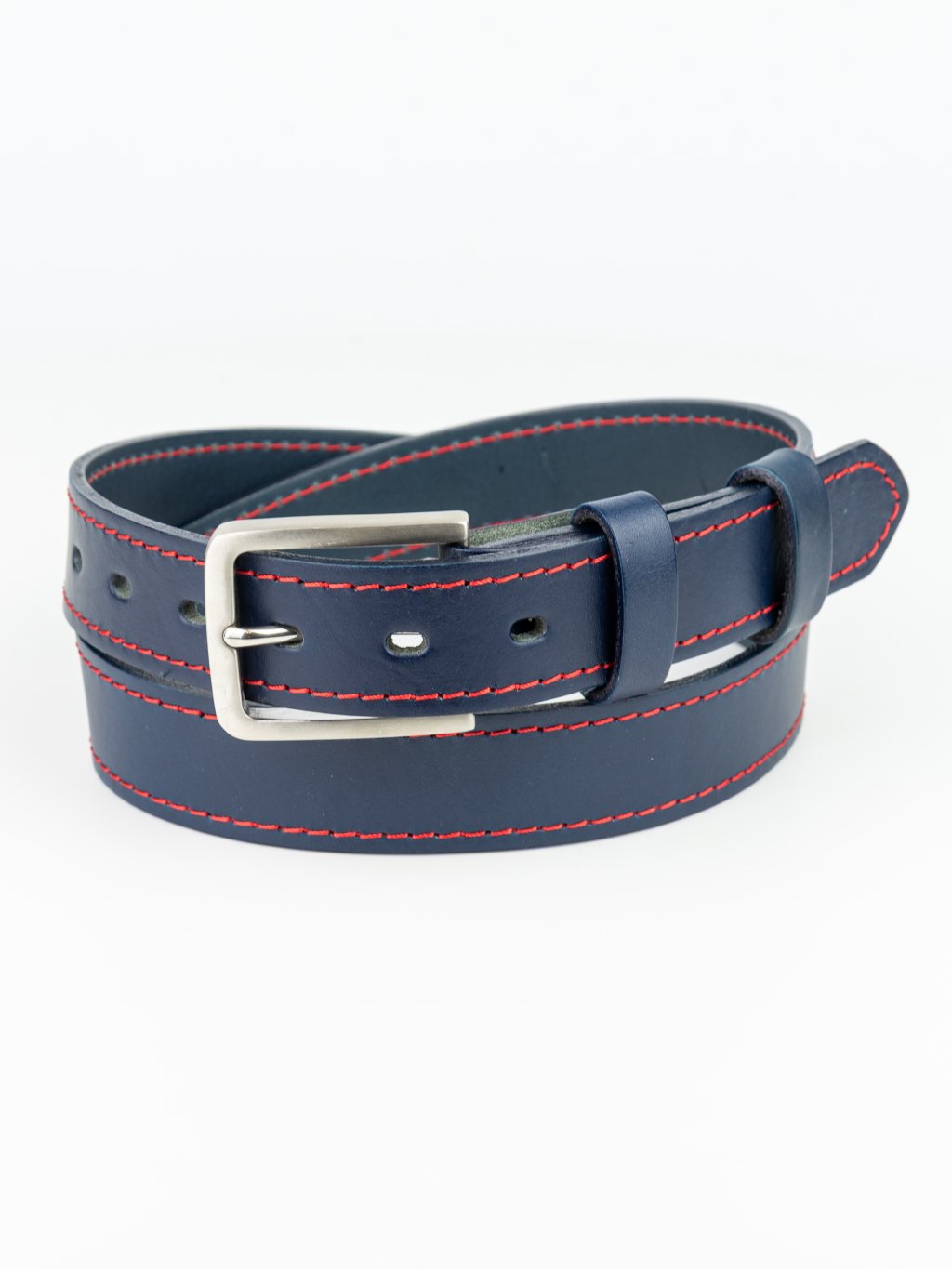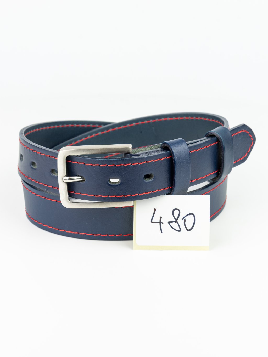 480 Henry opasek - modrý prošívaný červenou, ocelová spona, velikost M (Zachraň kůži = více ks) Univerzální pánský opasek. 1. jakost. Velikost M (na obvod pasu 92 – 107 cm). Délka opasku vč. spony cca 119 cm.