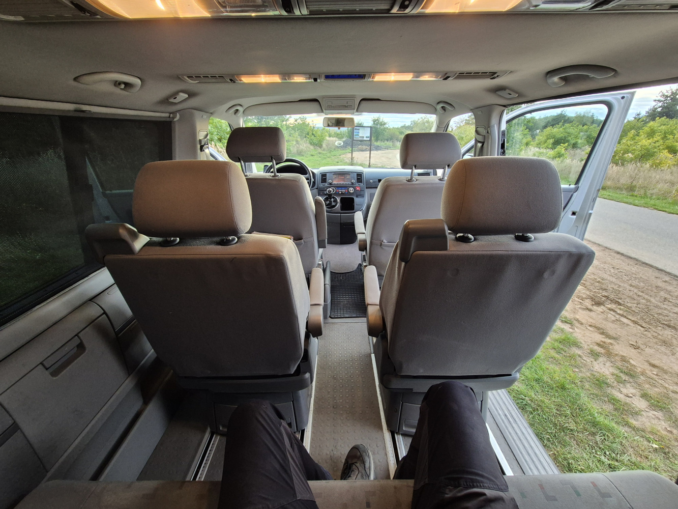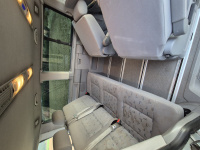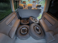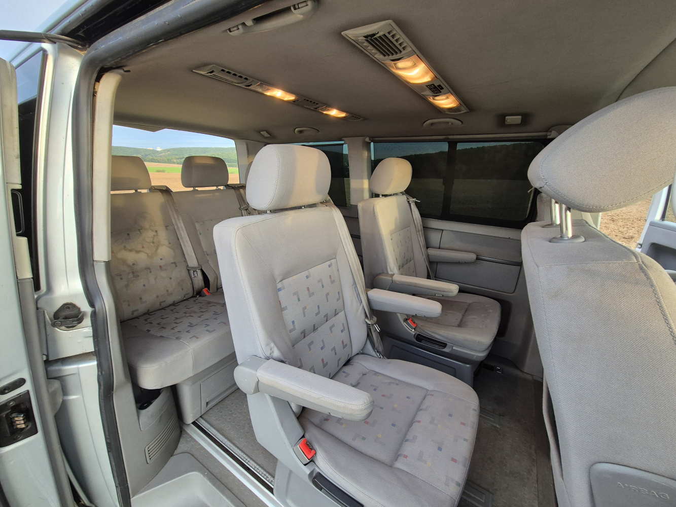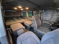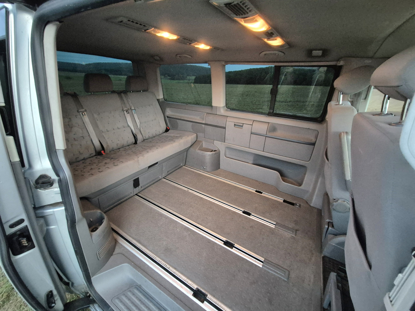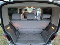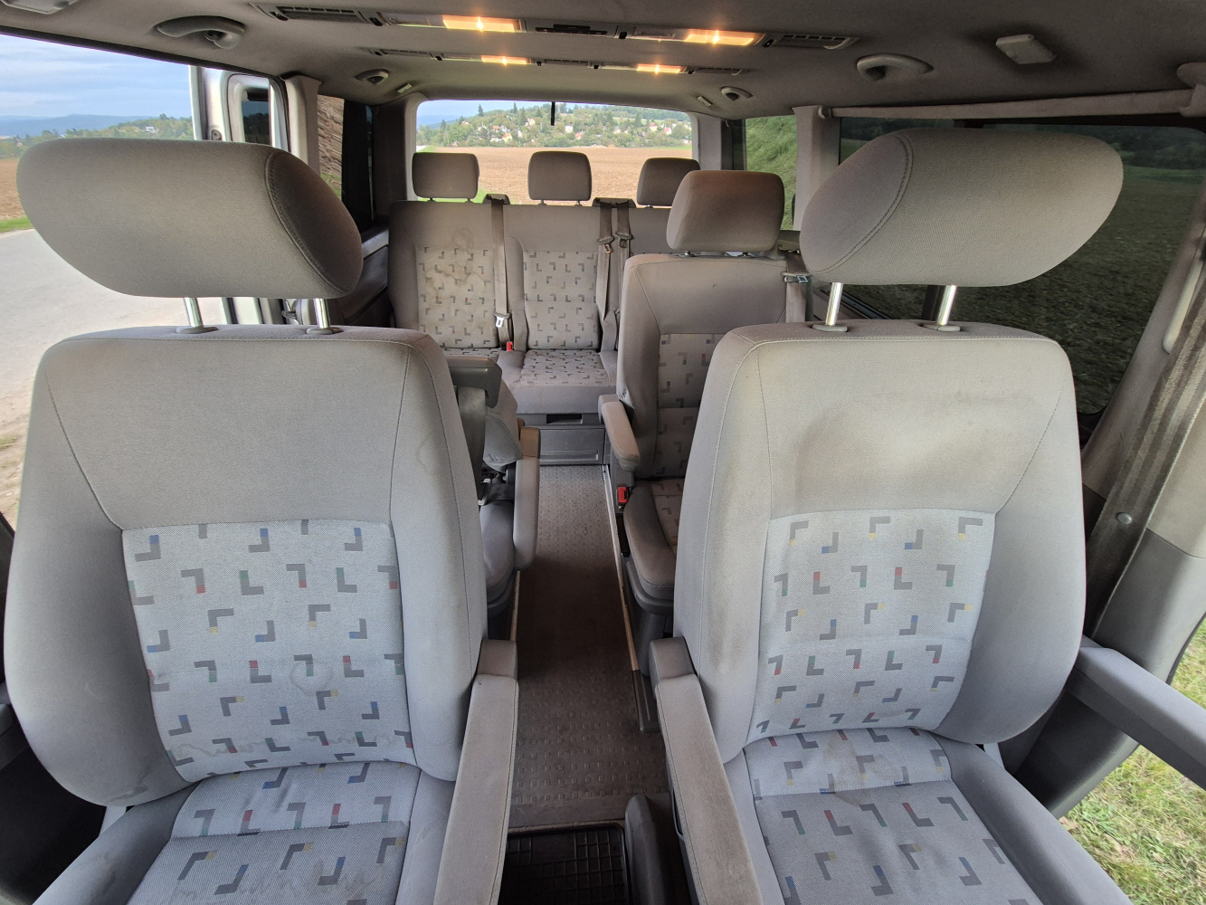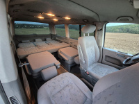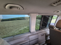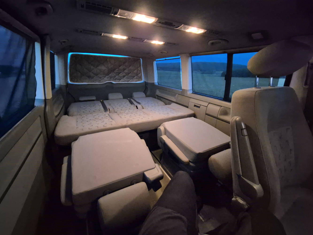 Vnitřní prostor je obrovský. Jakékoli jiné auto-nedodávka mi teď přijde malý. Sedačky jsou 2 + 2 + 3 a zepředu v pohodě projdete dozadu k dětem nebo nákladu mezi sedačkama. My to měli tak, že dopředu jsem pod spolujezdce nechal namontovat jednu z mála homologovaných otočných konzolí Sportcraft (při kempování mnohem otevřenější prostor), prostřední 2 pilotní sedačky jsem nechal ve sklepě a děti vozil vzadu na lavici přisunuté blíže. Do kufru se poté vlezl pes, kola, člun, bagáž na 14 dní, OSB desky, 55 EURO přepravek a další srandy. Podlaha je plastová, vpředu jsou gumové koberce na normálních kobercích. Nalijme si čistého vína - interiér nebyl perfektní ani při koupi po Němcích a po 6 letech se dvěma malými dětmi lépe nevypadá. Sedačky jsou prostě flekaté, strop místy taky (tam nevím, co s tím Němci dělali), některé plasty poškrábané a žádná leštěnka to po 20 letech prostě není a nebude. Většina plastových věcí ale nechybí a drží, a co se ulomilo, to jsme vyměňovali (třeba celý tapec dveří spolujezdce kvůli ulomené klice). Ale prostě, 20 let služby je potřeba brát v potaz. Viz fotky: