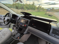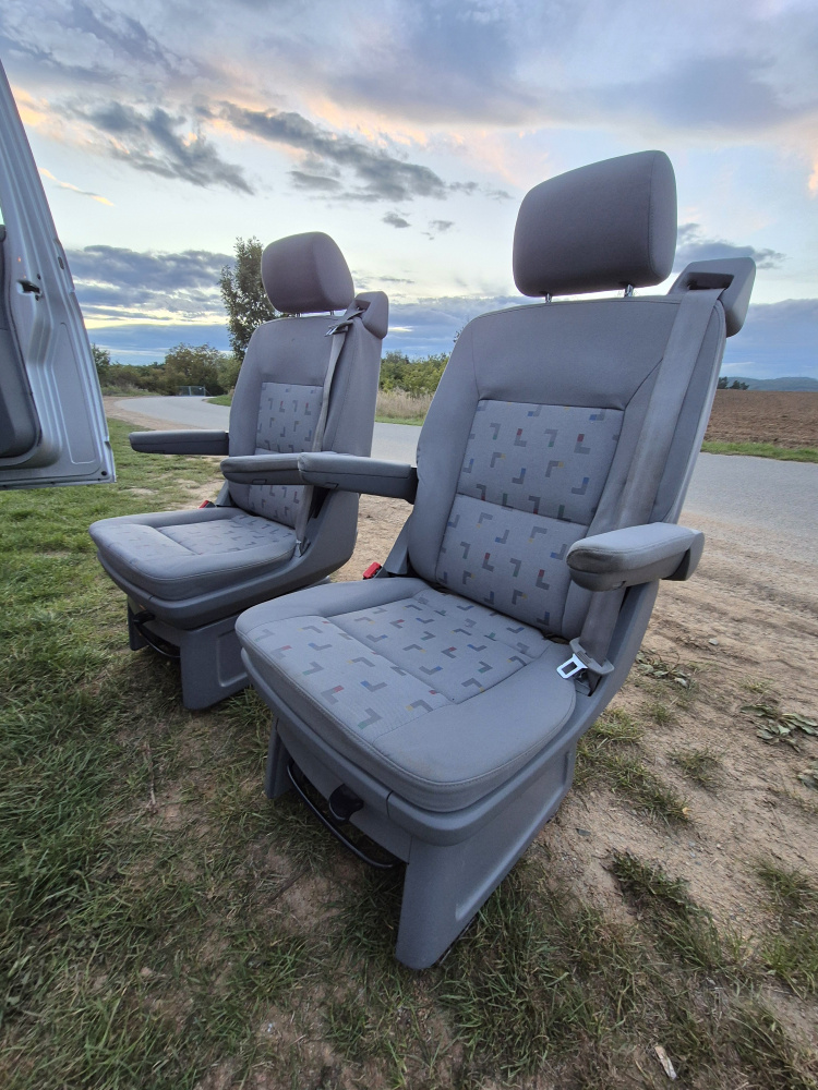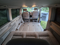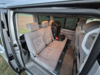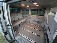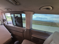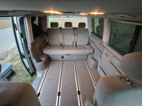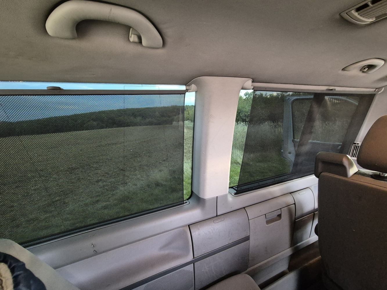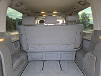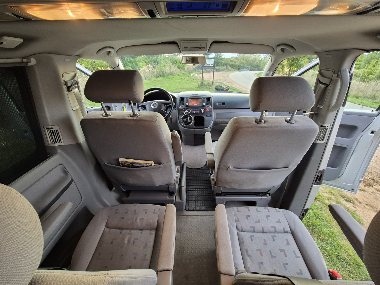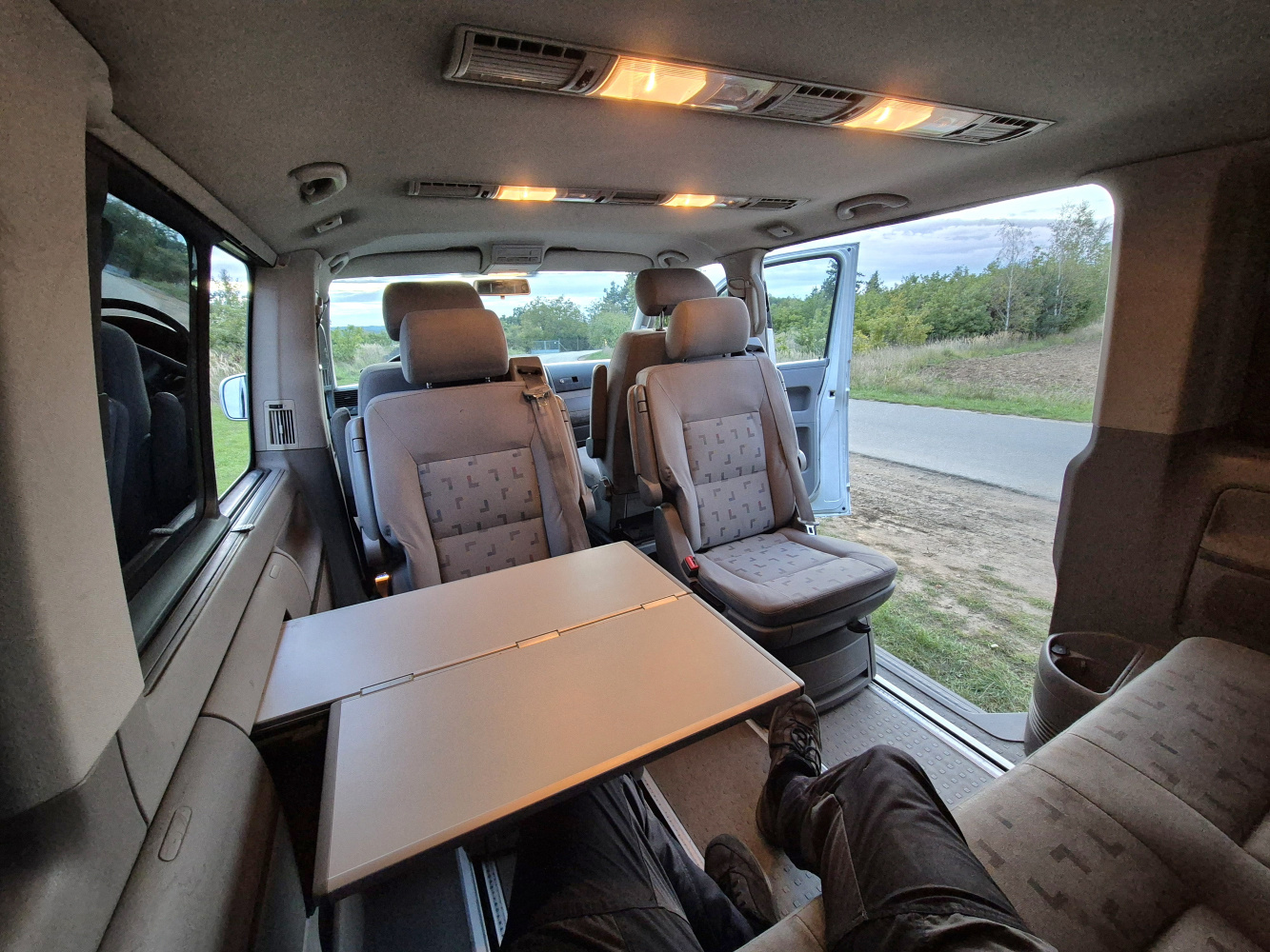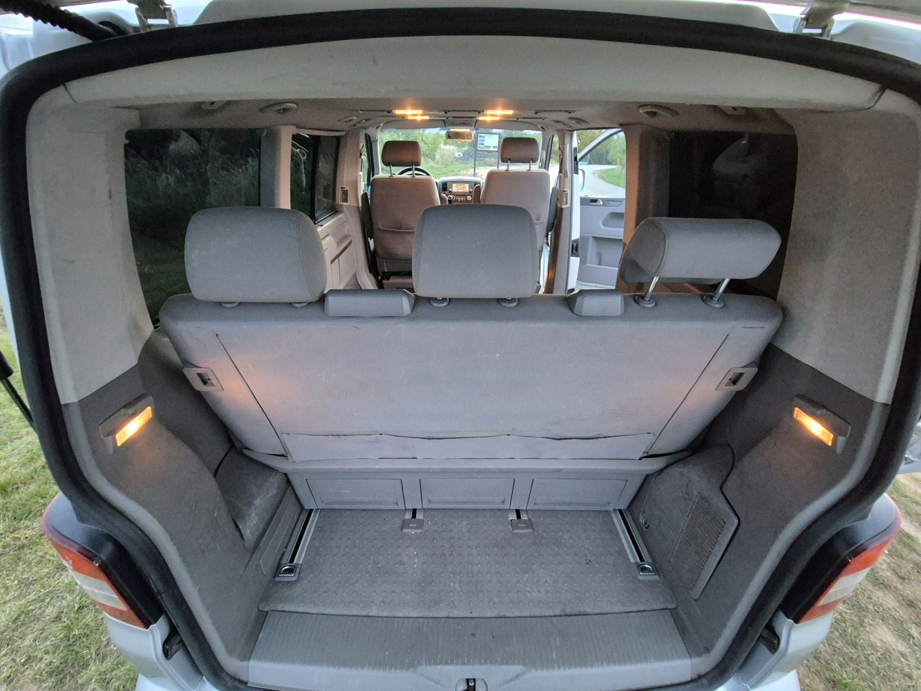 Vnitřní prostor je obrovský. Jakékoli jiné auto-nedodávka mi teď přijde malý. Sedačky jsou 2 + 2 + 3 a zepředu v pohodě projdete dozadu k dětem nebo nákladu mezi sedačkama. My to měli tak, že dopředu jsem pod spolujezdce nechal namontovat jednu z mála homologovaných otočných konzolí Sportcraft (při kempování mnohem otevřenější prostor), prostřední 2 pilotní sedačky jsem nechal ve sklepě a děti vozil vzadu na lavici přisunuté blíže. Do kufru se poté vlezl pes, kola, člun, bagáž na 14 dní, OSB desky, 55 EURO přepravek a další srandy. Podlaha je plastová, vpředu jsou gumové koberce na normálních kobercích. Nalijme si čistého vína - interiér nebyl perfektní ani při koupi po Němcích a po 6 letech se dvěma malými dětmi lépe nevypadá. Sedačky jsou prostě flekaté, strop místy taky (tam nevím, co s tím Němci dělali), některé plasty poškrábané a žádná leštěnka to po 20 letech prostě není a nebude. Většina plastových věcí ale nechybí a drží, a co se ulomilo, to jsme vyměňovali (třeba celý tapec dveří spolujezdce kvůli ulomené klice). Ale prostě, 20 let služby je potřeba brát v potaz. Viz fotky: