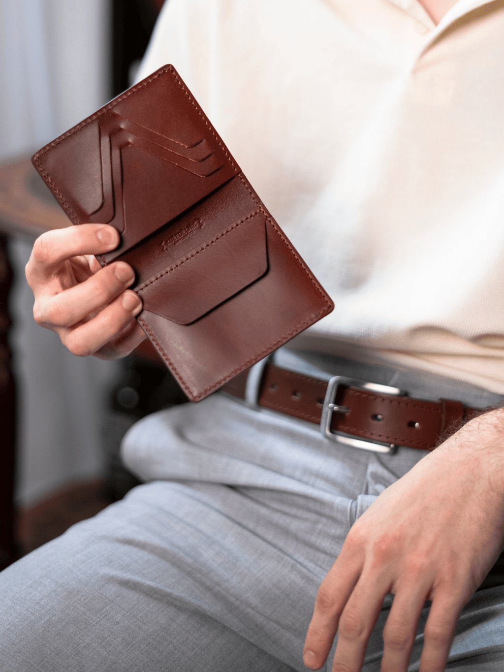 Moderní minimalistická peněženka Henry z prémiové italské kůže Buttero vyniká elegantním designem, tenkým profilem a praktickým uspořádáním. Díky kompaktním rozměrům se pohodlně vejde do kapsy kalhot i saka, a přesto pojme 8–10 karet, mince i bankovky. Originálně tvarované kapsy na karty zaručují bezpečné uložení bez zbytečného objemu, zatímco kapsa na mince bez zapínání udržuje maximální štíhlost. Na přání Vám na čelní stranu vyrazíme monogram, který z peněženky udělá osobitý doplněk pro každého milovníka minimalismu.