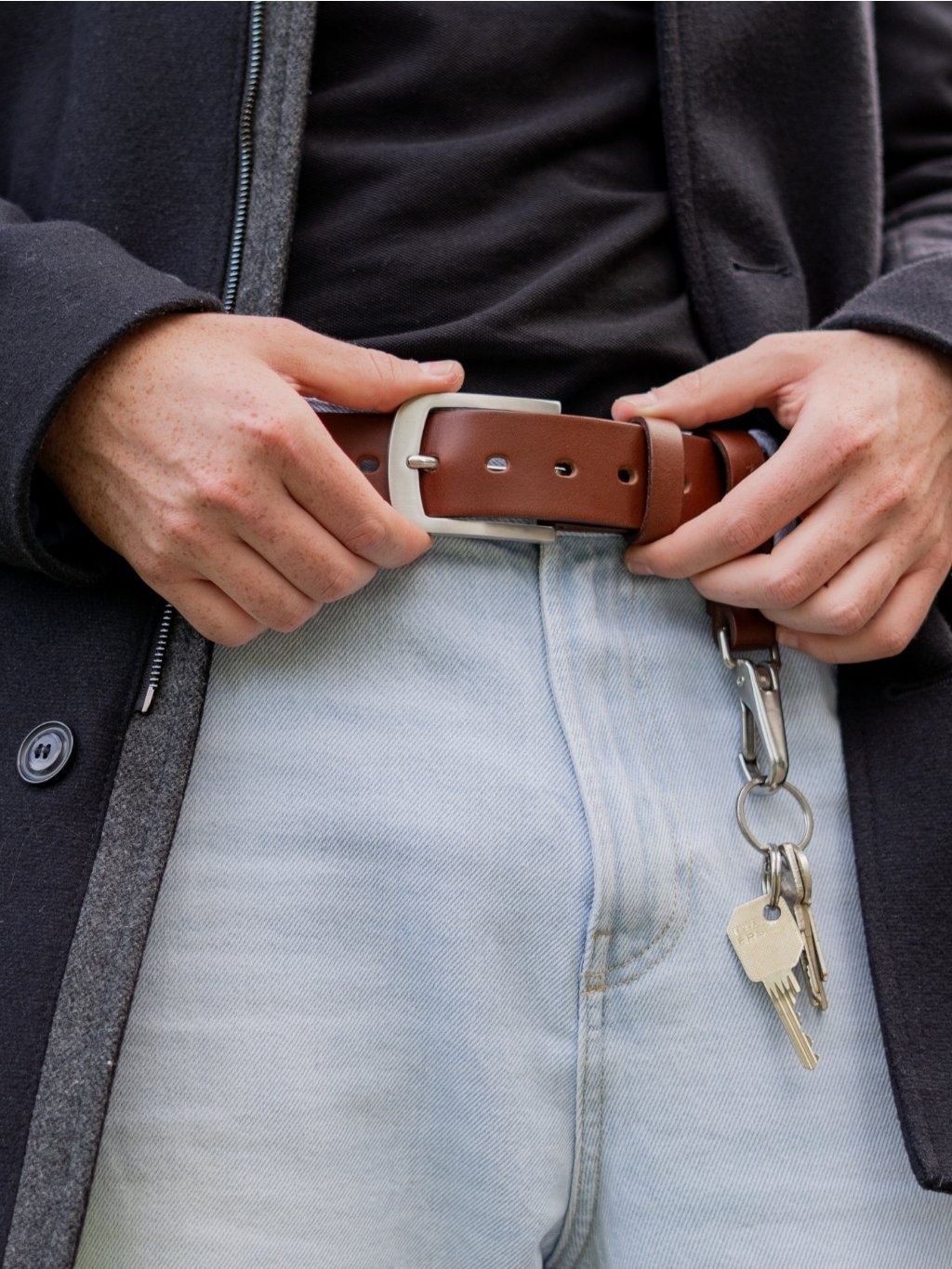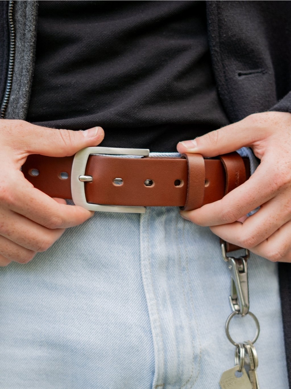 Masivní kožená klíčenka, kterou můžete nosit i jako poutko na opasek, je ideální pro zavěšení klíčů nebo čehokoli, co chcete mít vždy po ruce. Díky své pevnosti zvládne utáhnout tři bečky piva nebo desetinu Fábie – o její odolnosti tedy není pochyb. Elegantní nerezová karabina perfektně ladí s našimi riflovými pásky a dodává klíčence stylový vzhled. Na přání Vám navíc z vnější strany vyrazíme originální monogram, který z ní udělá osobitý doplněk nebo skvělý dárek.