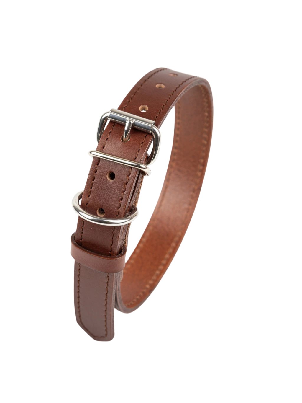 Jeho základem je poctivá italská kůže o síle téměř 4 mm a bytelné nerezové kování, které zaručují mimořádnou pevnost. Díky ideální šířce 2,5 cm a chytrému designu s D-kroužkem, který chrání krk před tlakem přezky, je však neuvěřitelně pohodlný a psa nijak neomezuje.