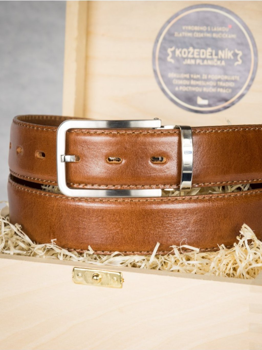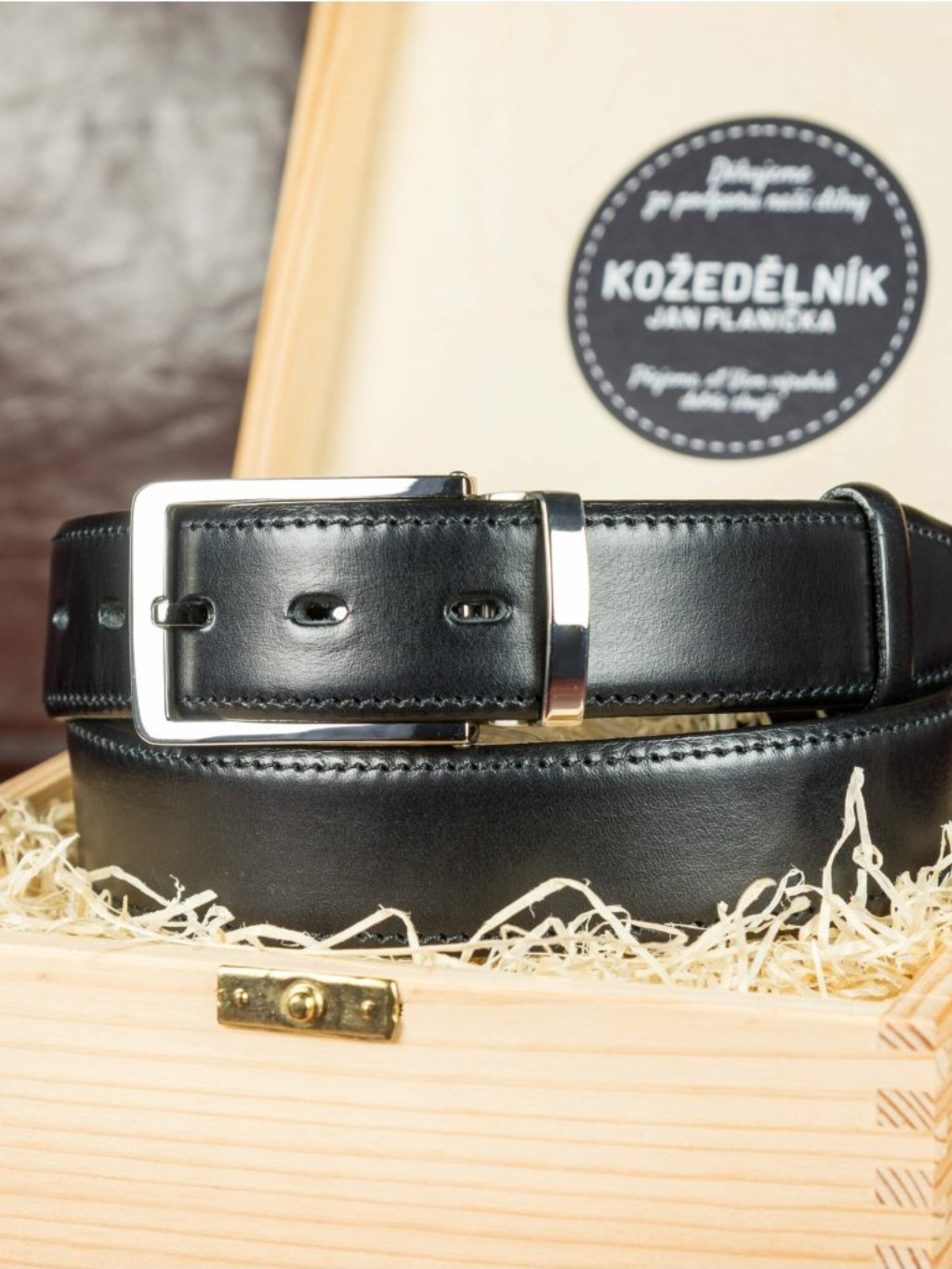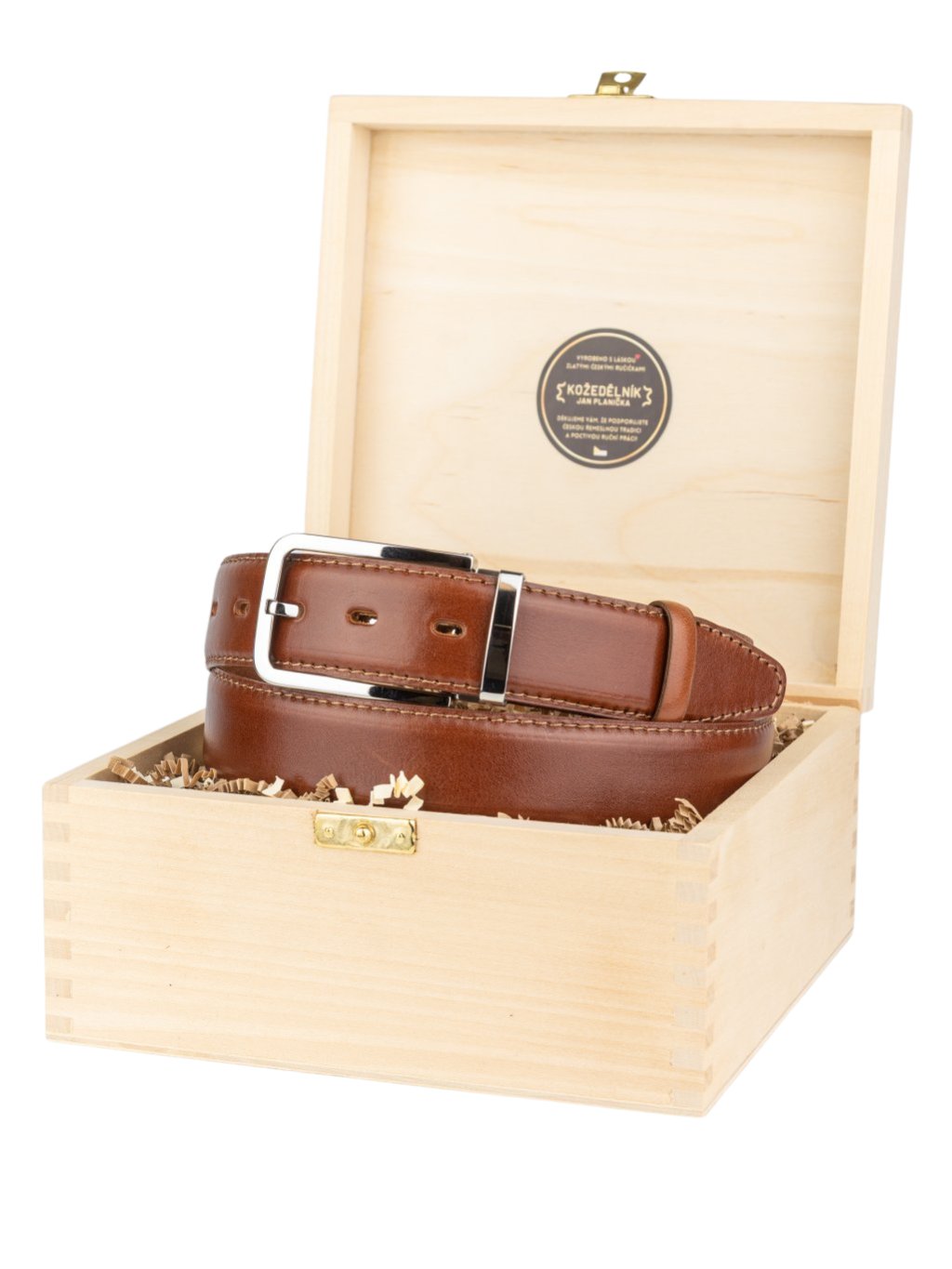 Tento cca 3,3 cm široký opasek ze dvou vrstev kvalitní hověziny se zabroušenými hranami nabízí dokonalé pohodlí a elegantní vzhled. Luxusní přezka z nerezové oceli je pevně uchycena pomocí dvou šroubků, takže ji můžete snadno sejmout a opasek si přizpůsobit přesně podle sebe. Vyberte si ideální délku z široké nabídky velikostí a dopřejte si osobní dotek v podobě originální ražby monogramu nebo celého jména. Každý opasek je dodáván v luxusním dřevěném boxu, který poslouží nejen jako dárkové balení, ale i jako stylové místo pro uložení vašich cenností.