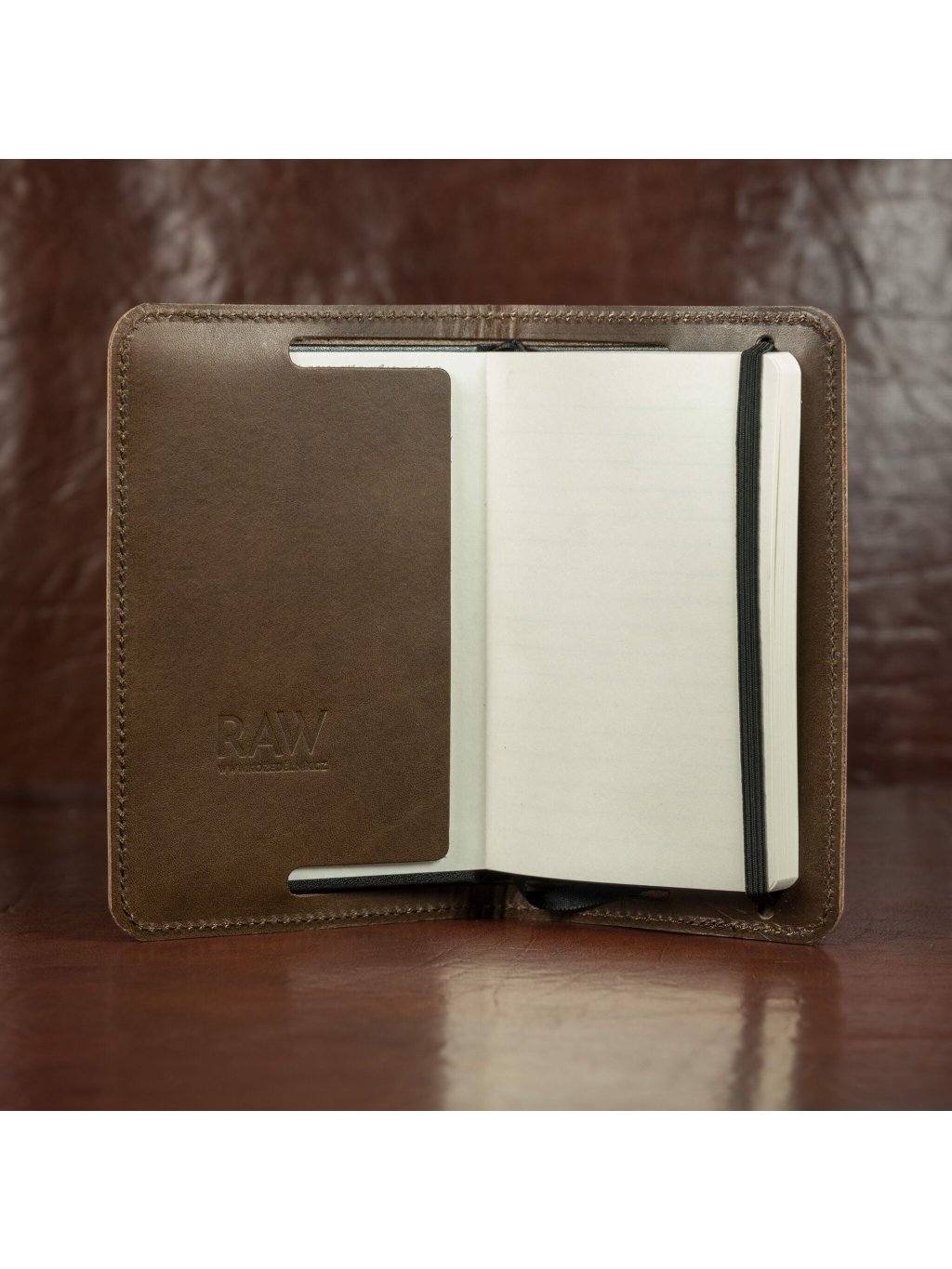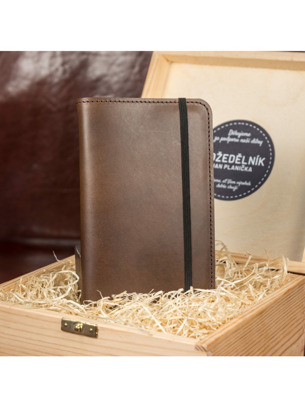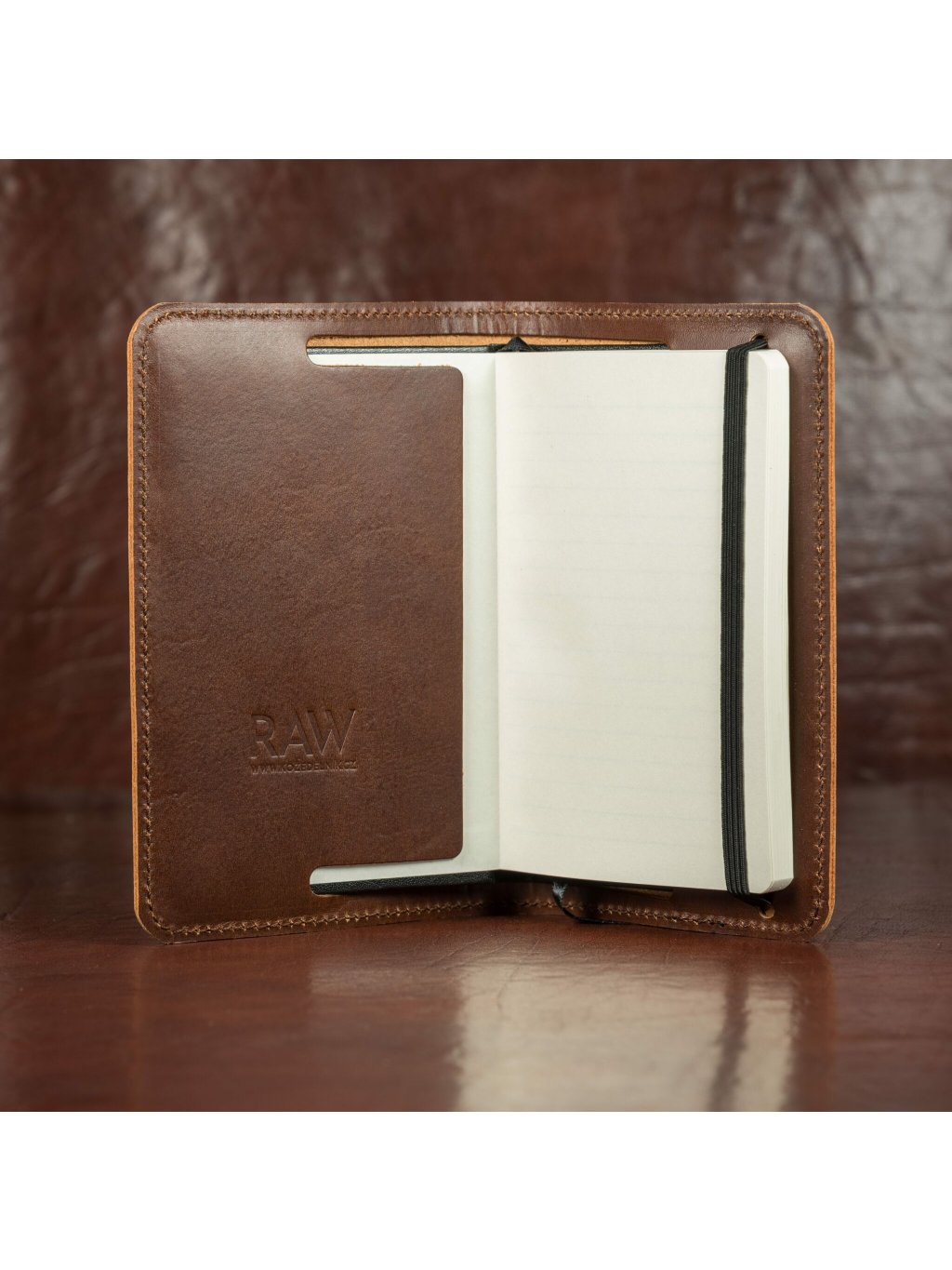 Decentní kožený obal na zápisník z lícové hovězí usně v kapesní velikosti A6.