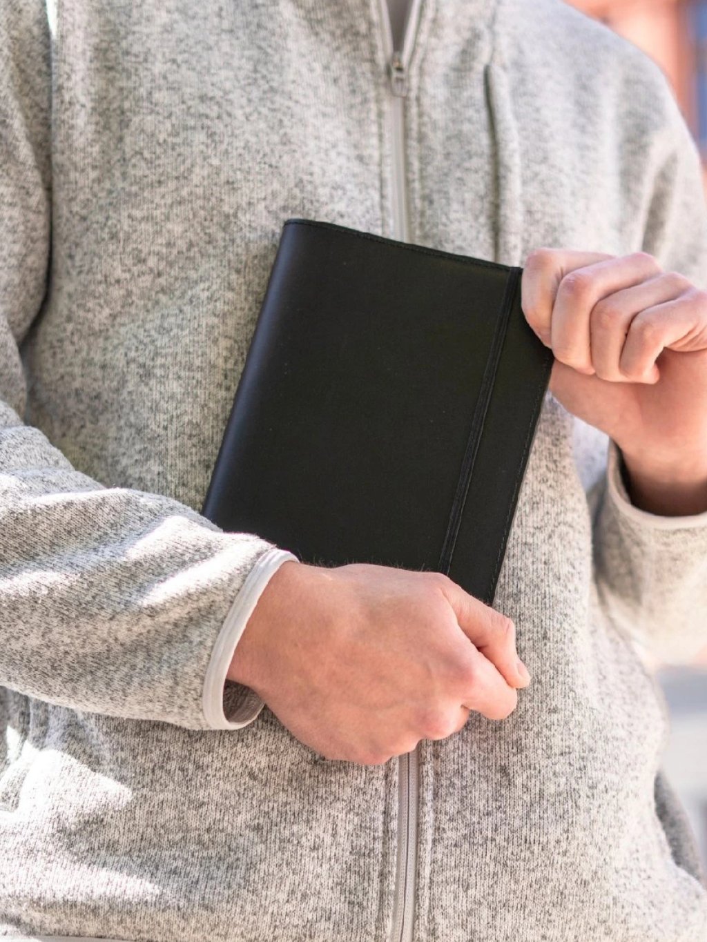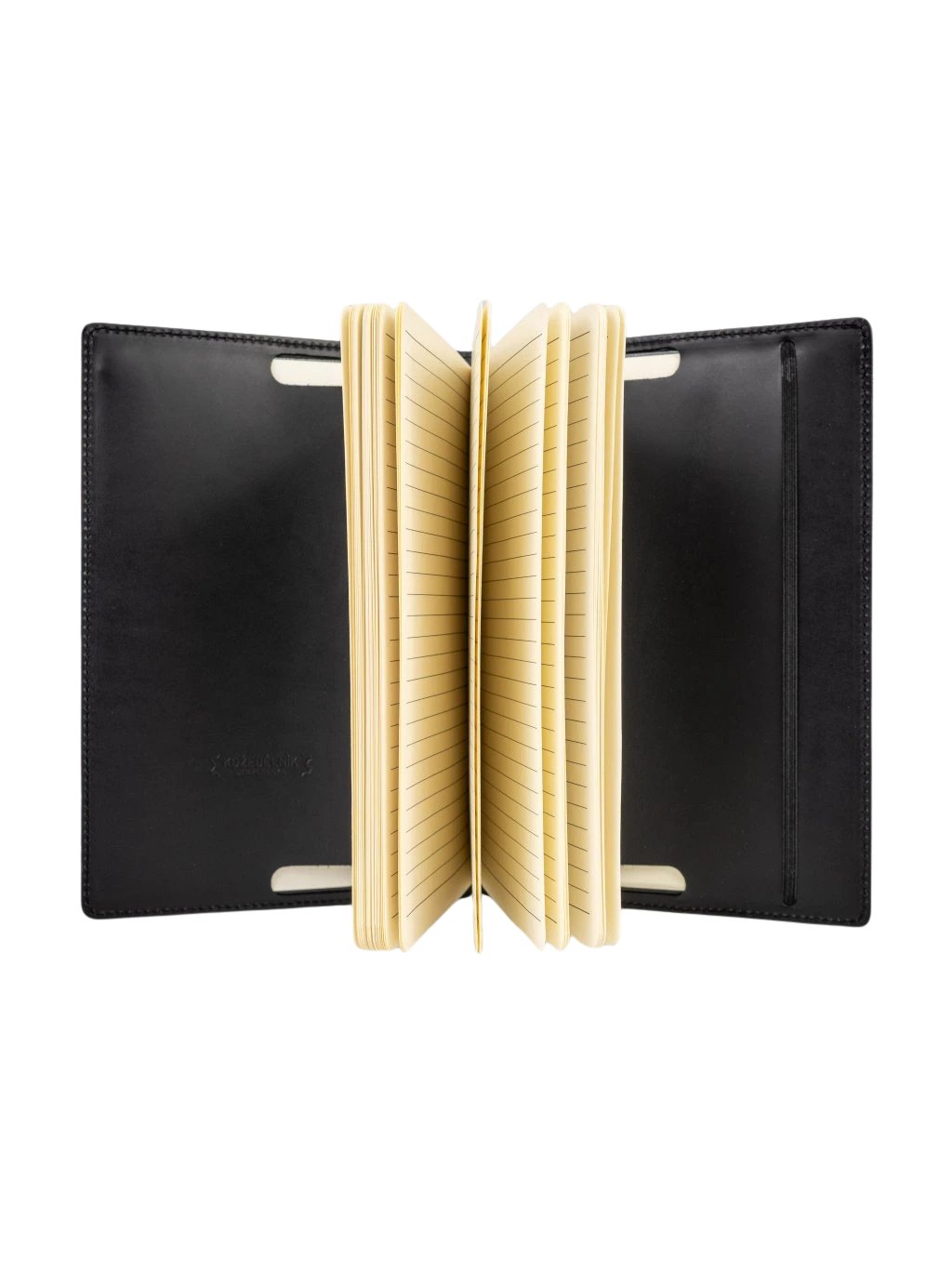 Nejoblíbenější formát pro běžné nošení, do tašky i batohu, kam se vejdou všechny Vaše poznámky a projekty. Stejně jako u luxusnější varianty z kůže Buttero i u tohoto obalu zůstávají stránky zápisníku protažené konstrukci vnitřních "uší" obalu při psaní dokonale rovné - nemáte prostě uprostřed stránky hrbol. Nechtěnému otevírání zabrání pruženka na zápisníku, přetažená přes obal.
