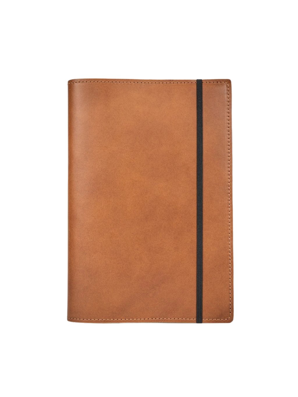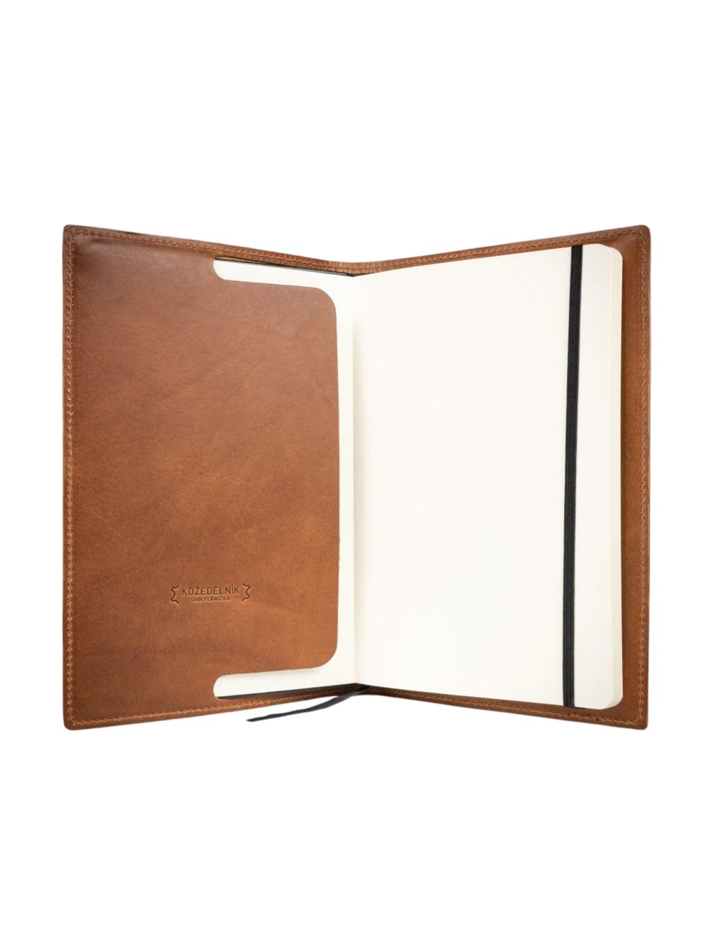 Decentní kožený obal na zápisník z lícové hovězí usně v kapesní velikosti A5.