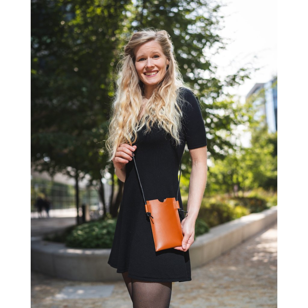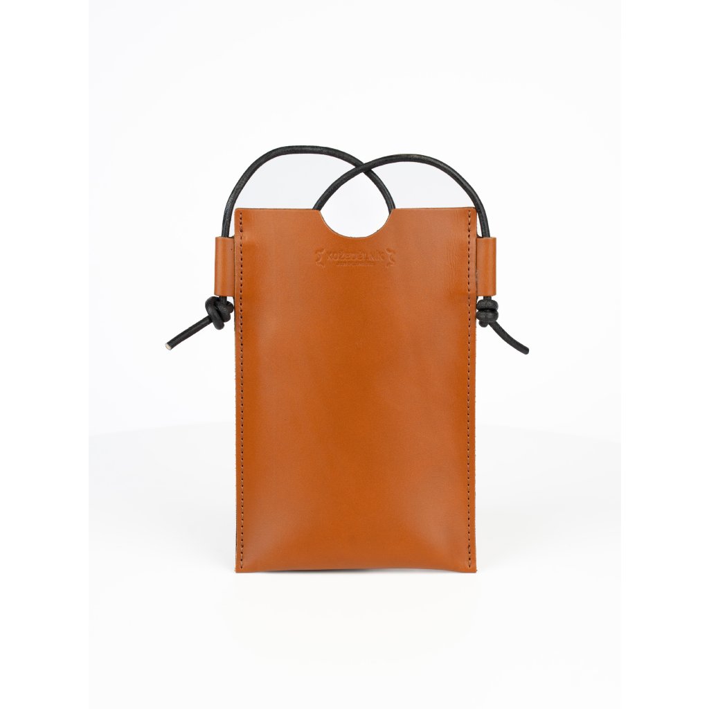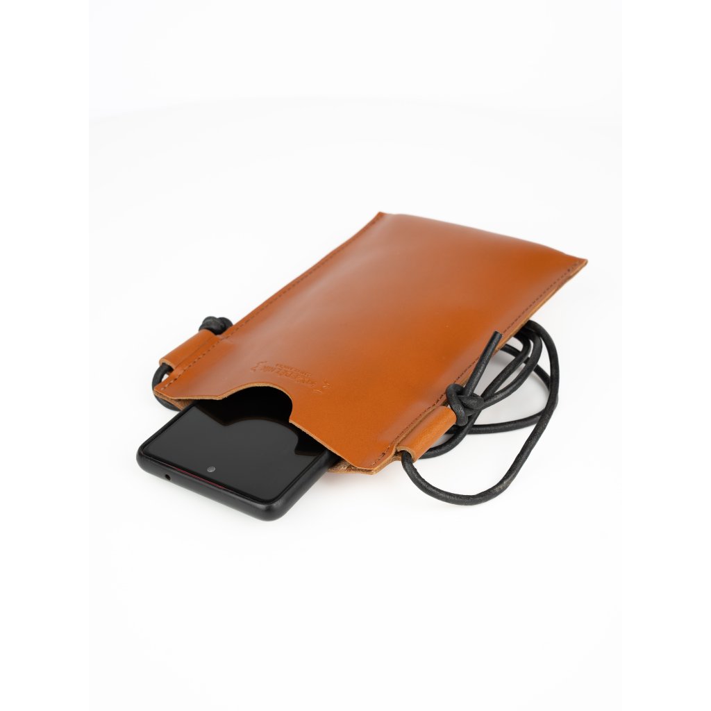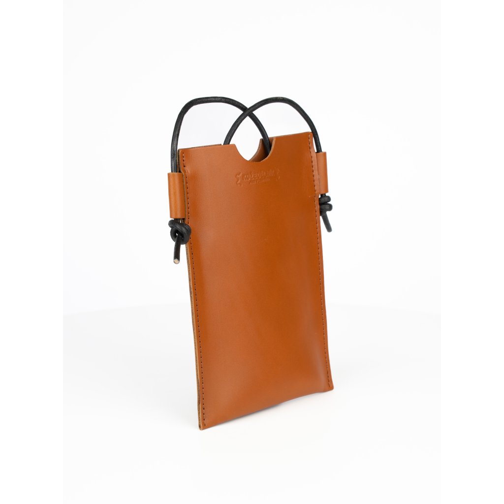 Laura Pouzdro na telefon - koňakové Pevné kožené pouzdro na telefon s nastavitelným popruhem. Hodí se k shopperce Laura.