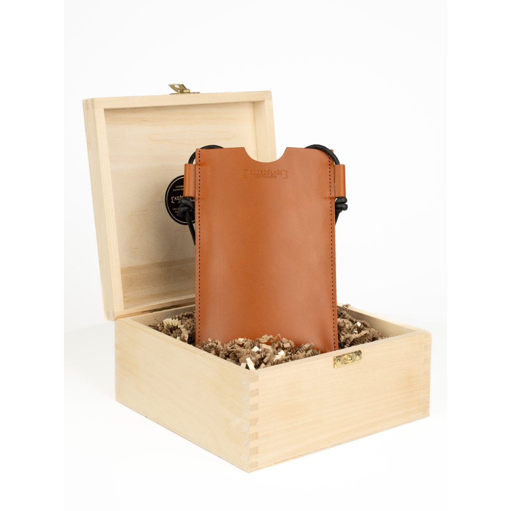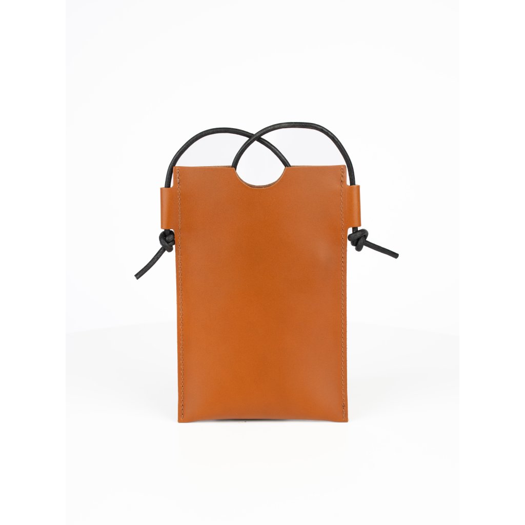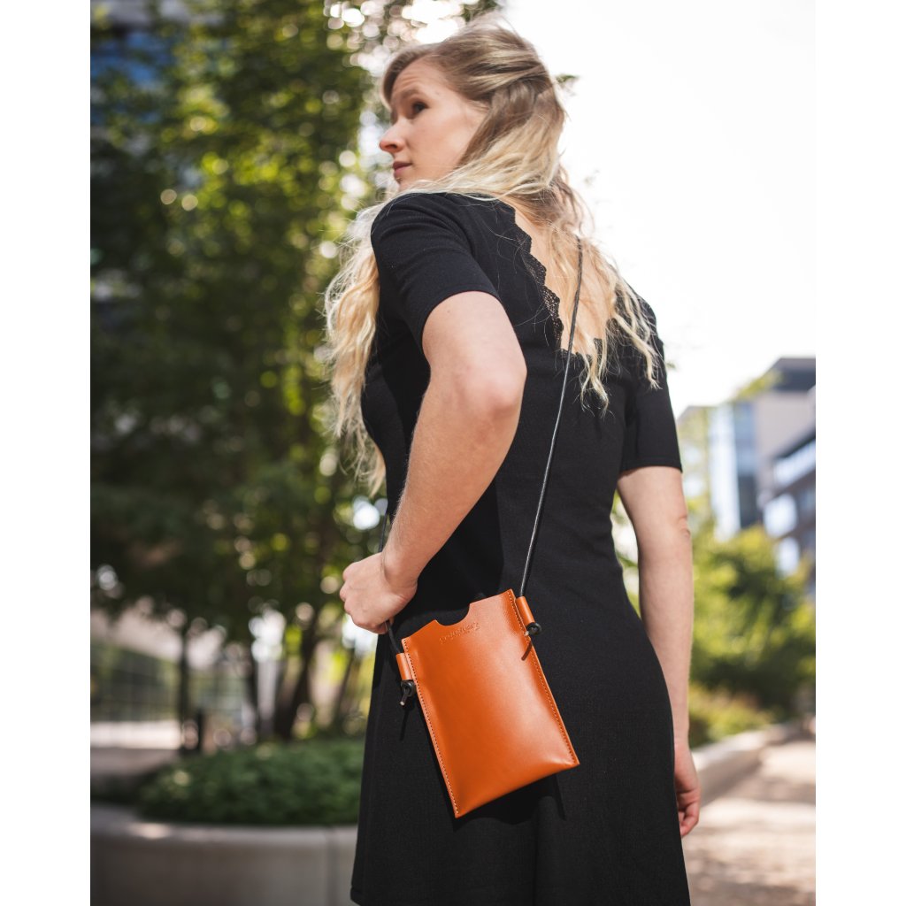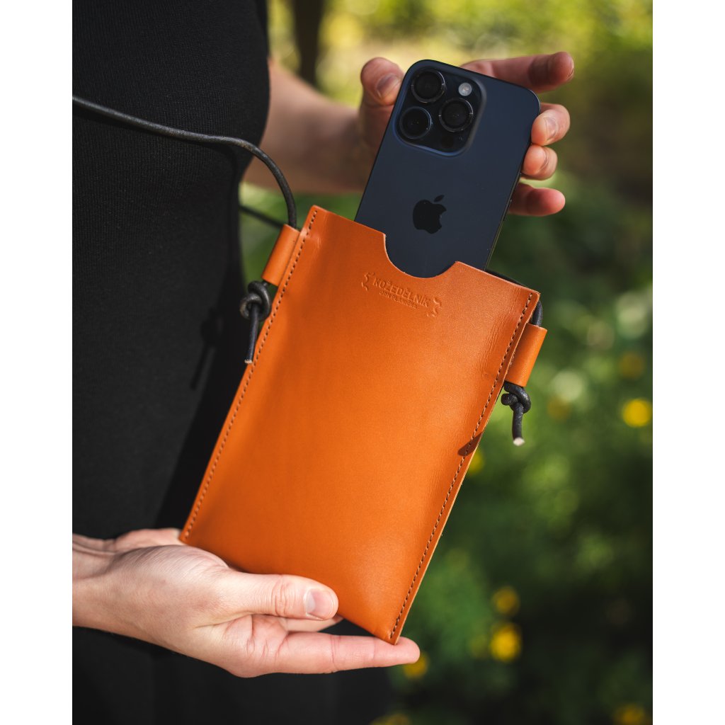 Laura Pouzdro na telefon - koňakové Pevné kožené pouzdro na telefon s nastavitelným popruhem. Hodí se k shopperce Laura.