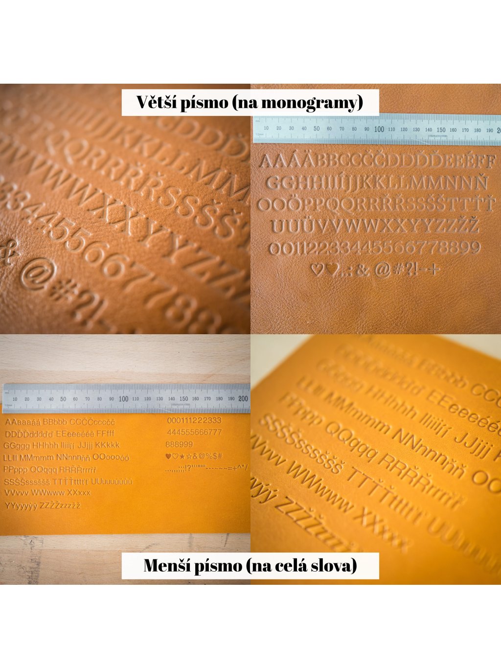 Monogram: rádi Vám z ledvinky uděláme podepsaný originál přímo pro Vás. Text razíme viditelně na čelní stranu kabelky, doprostřed nad druk (foto písmen a varianty najdete v galerii fotek výše).
