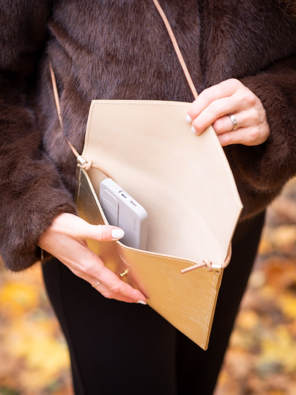 Luxusní psaníčko Emily z jemné zlaté kůže okouzlí svou elegancí a perfektně zapadne do celé kolekce Goldie. Zlatý povrch je pečlivě zpevněn přírodní vepřovicí a jeho dokonale zabroušené hrany s profesionální úpravou podtrhují skutečnou řemeslnou kvalitu. Uvnitř najdete praktickou užší kapsu, kam pohodlně schováte telefon, karty, rtěnku i kapesníčky – přesně to, co chcete mít vždy po ruce. Délku popruhu si snadno přizpůsobíte svému stylu, ať už preferujete nošení přes rameno, nebo ležérně křížem. A když zatoužíte po ještě jemnějším, večerním vzhledu, jednoduše popruh odvázáte a Emily vezmete do ruky jako stylové psaníčko.