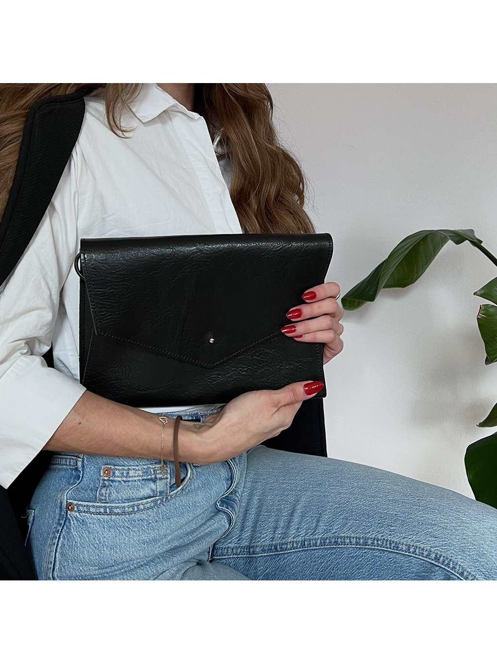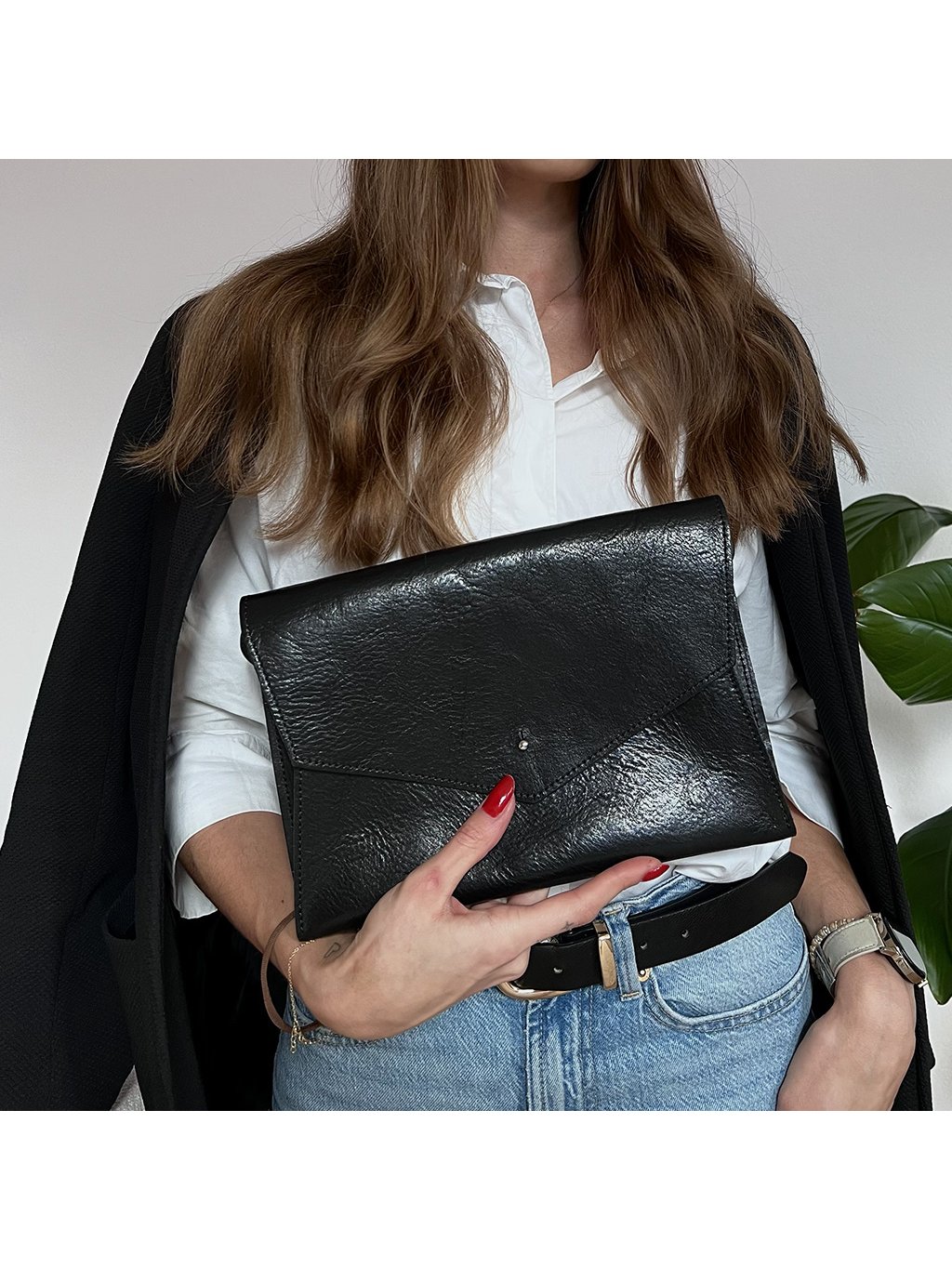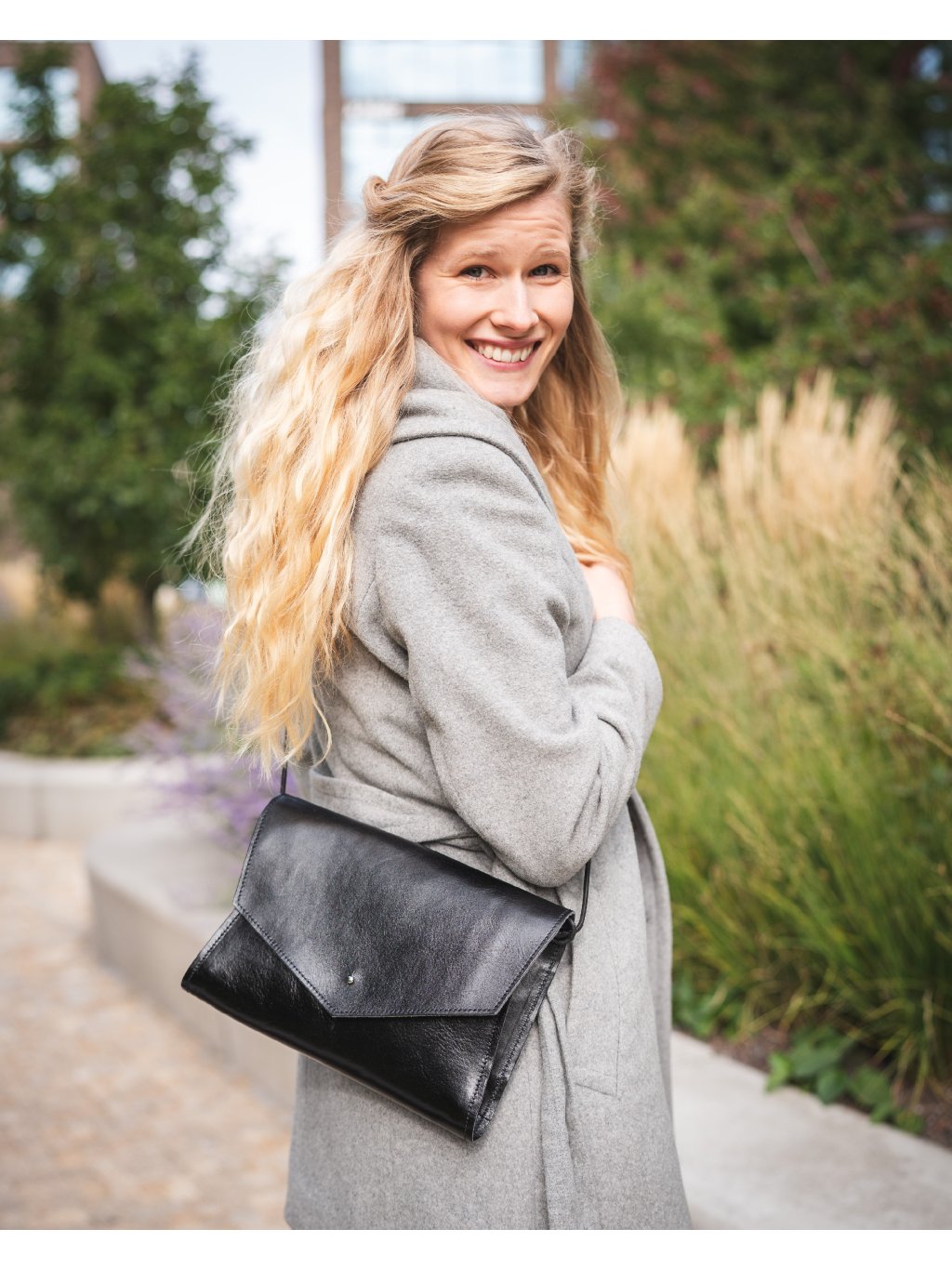 Tahle elegantní kabelka vychází z oblíbeného psaníčka, ale nabízí více prostoru díky chytrému rozevíracímu střihu. Pohodlně do ní uložíte telefon, klíče, peněženku i další nezbytnosti a oceníte i praktickou vnitřní kapsičku. Sedlářský knoflík zajišťuje jednoduché, ale spolehlivé zapínání. Nastavitelný kožený popruh s rozšířením si přizpůsobíte přesně podle sebe, případně ho můžete zkrátit nebo úplně schovat. Kabelku tak snadno proměníte v elegantní psaníčko do ruky i stylový doplněk na předloktí.