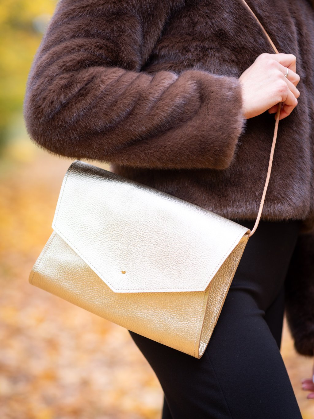 Luxusní kabelka Goldie Mia v elegantní zlaté kůži okamžitě přitáhne pozornost a dokonale doplní každý outfit moderní ženy. Harmonicky ladí se zbytkem kolekce Goldie, takže snadno vytvoříte sladěný a sofistikovaný look. Jemná zlatá kůže je pečlivě podlepená přírodní vepřovicí, která kabelce propůjčuje pevnější tvar a příjemný pocit z používání. Uvnitř najdete prostornou kapsu na větší peněženku i užší přihrádku na telefon nebo platební karty, takže budete mít vše přehledně po ruce. Díky nastavitelnému popruhu a zlatému posuvnému rozšíření můžete Miu nosit přes rameno, křížem i elegantně v ruce jako stylové psaníčko.