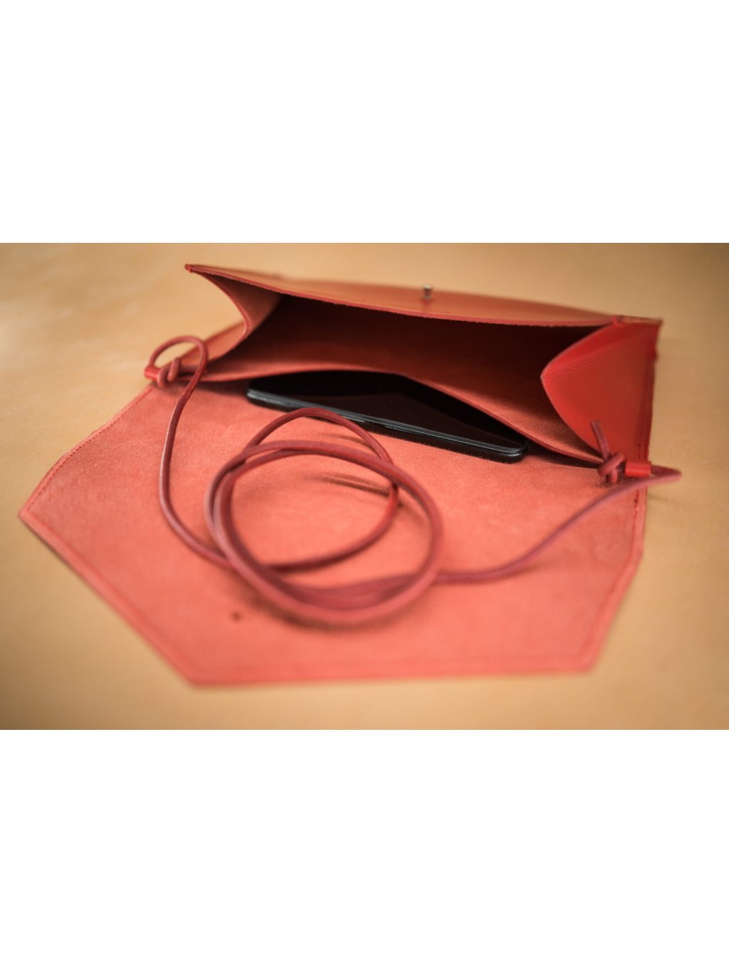 Vnitřní prostor disponuje i plochou zadní kapsičkou na mobil nebo jinou placatou věc. Oproti klasické verzi je toto vyrobené z prémiové italské kůže Buttero, s kontrastním šitím a šňůrkou z kontrastní barvy. Jednoduché zapínání řeší sedlářský knoflík. Tenký popruh z kulatého koženého řemínku můžete odepnout nebo schovat dovnitř pro snadné nošení v ruce.