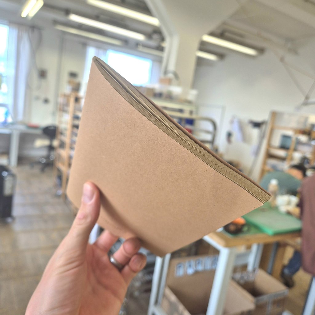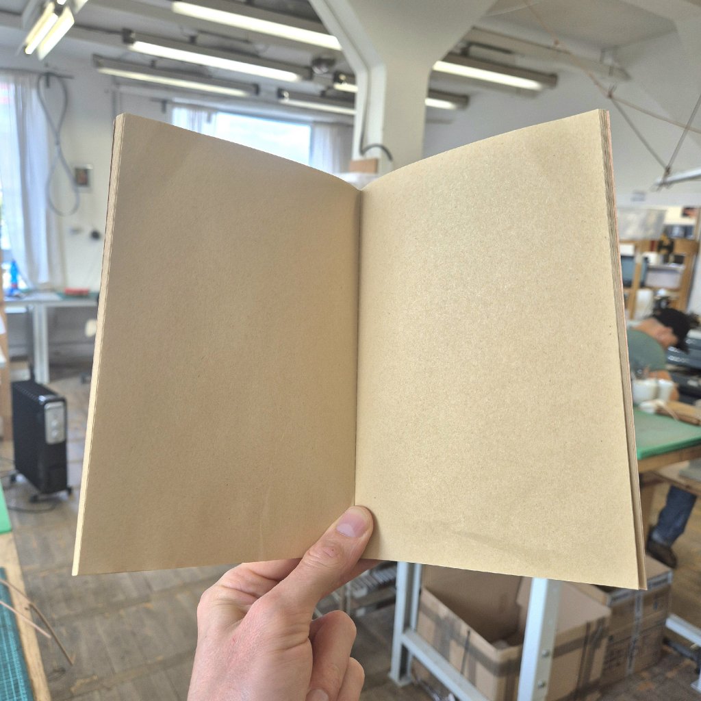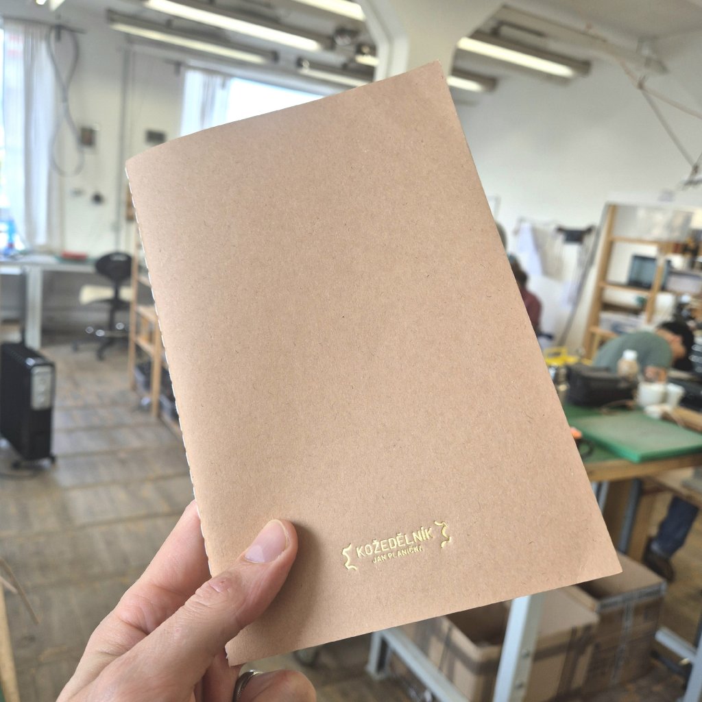 Zápisník formátu A5 s deskami z kartonu (250 gr/m2), 80 stránkami nelinkovaného recyklovaného papíru (70 gr/m2) a s decentní zlatou ražbou loga Kožedělník.