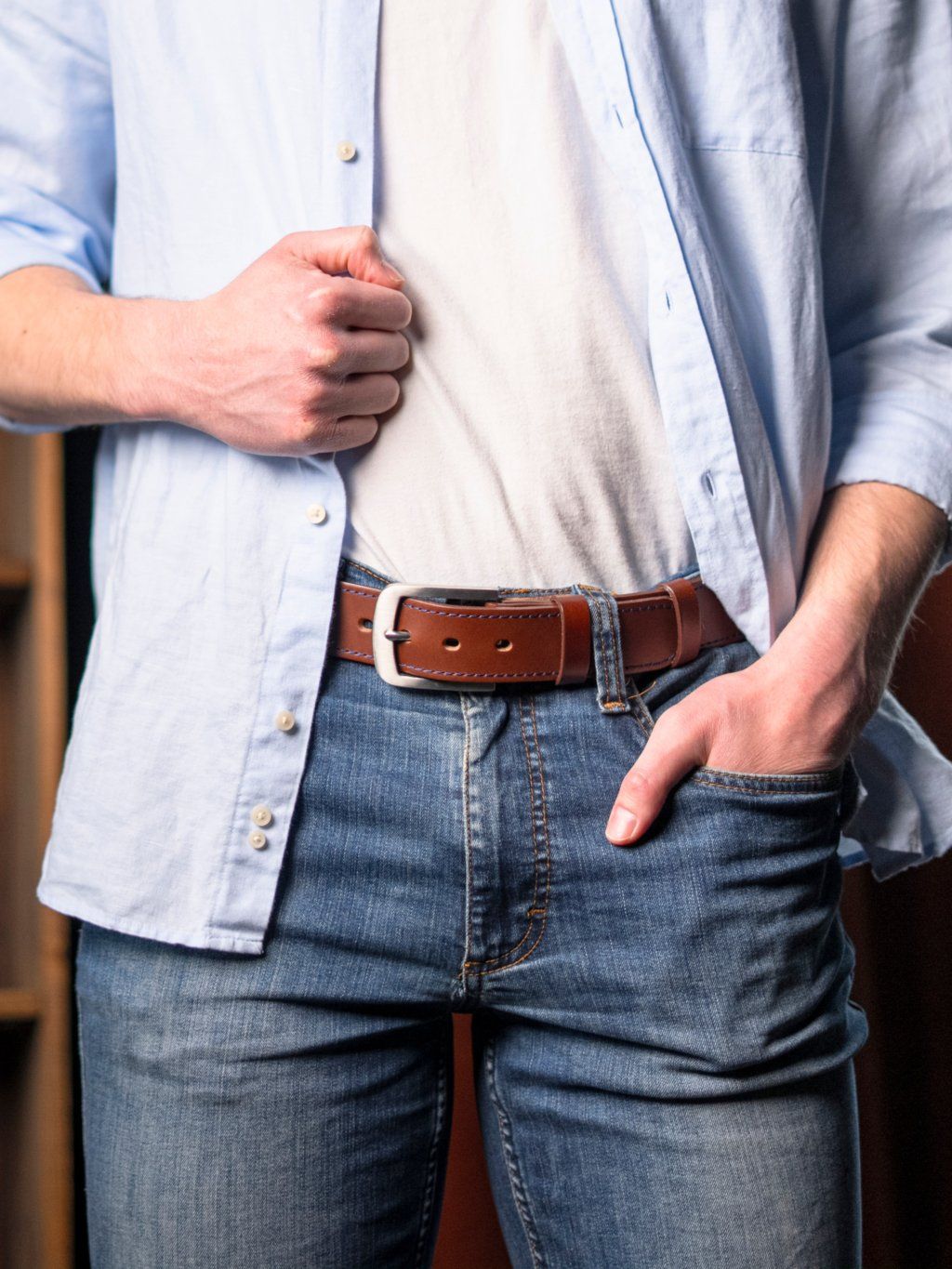 Tento opasek z poctivé hověziny o šířce cca 3,8 cm je pevný, přitom příjemně poddajný a pohodlný na nošení. Každý kus je ručně vyroben na míru vašemu pasu a doplněn nerozbitnou přezkou z nerezové oceli, mosazi nebo odolné zinkoslitiny. Designové barevné prošití a možnost ražby monogramu či jména dodávají opasku osobitý charakter a eleganci. Dvě pevné kožené průvlečky drží volný konec přesně tam, kde má být – čistě a bez vyčnívání. Celý dojem završuje luxusní dárkový box ze dřeva, díky kterému se opasek stává ideálním dárkem i stylovým doplňkem pro každodenní nošení.