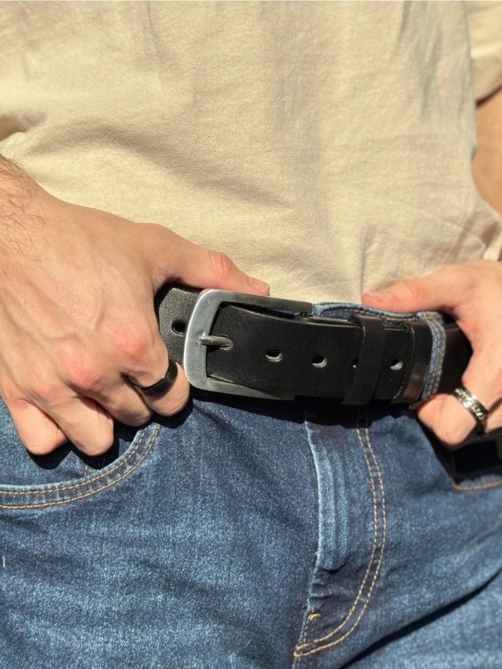 - cca 3,8 cm široký řemen z 3,0-4,0 mm silné hověziny se zabroušenými hranami, který je pohodlný a netlačí