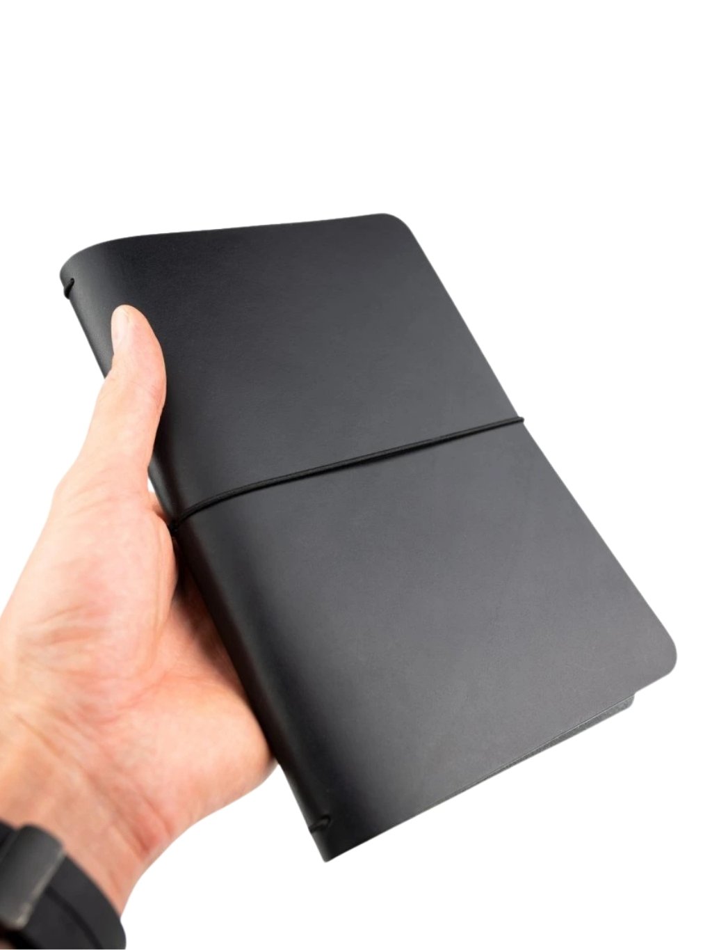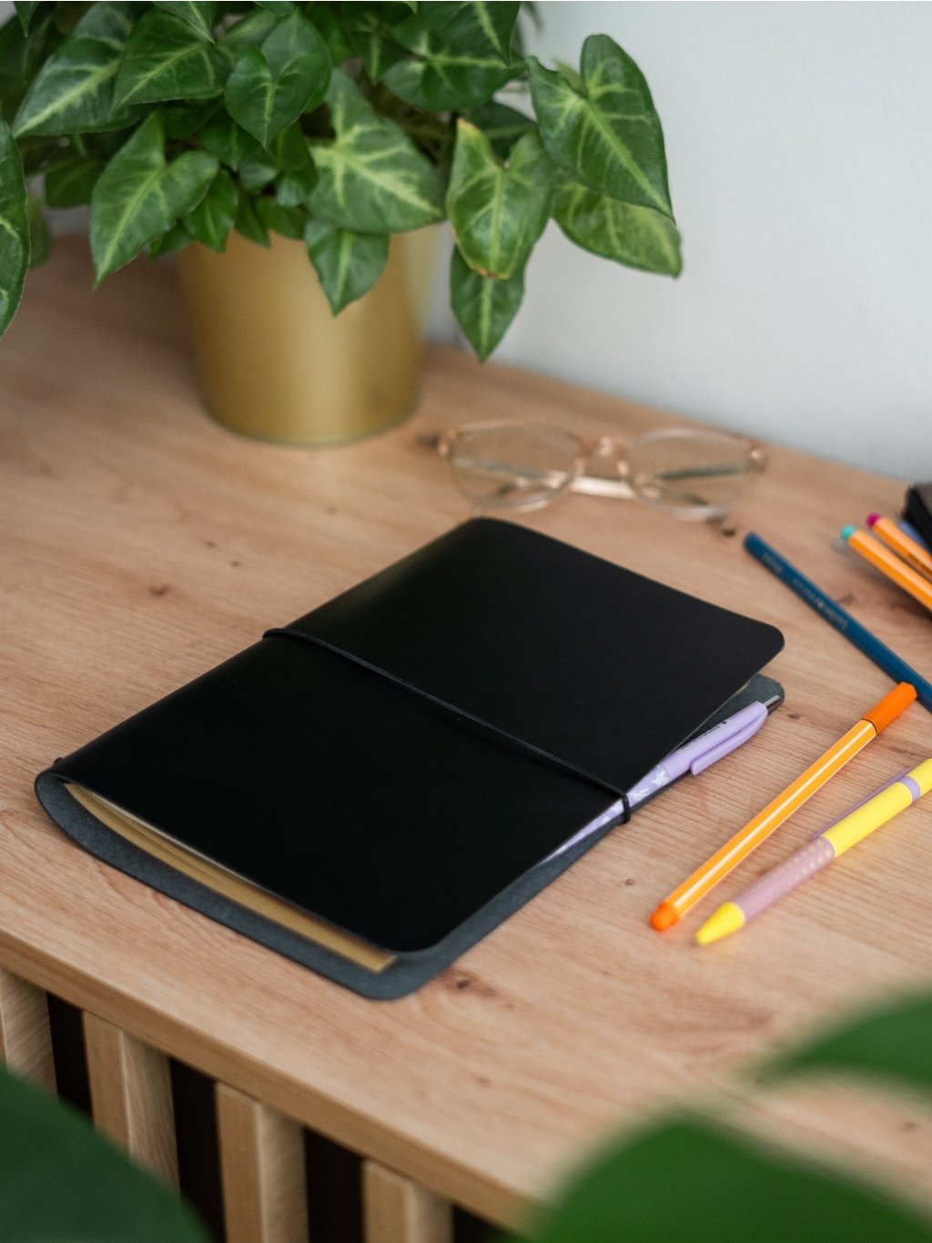 Decentný kožený obal na zápisník z lícovej hovädzej usne vo vreckovej veľkosti A5.